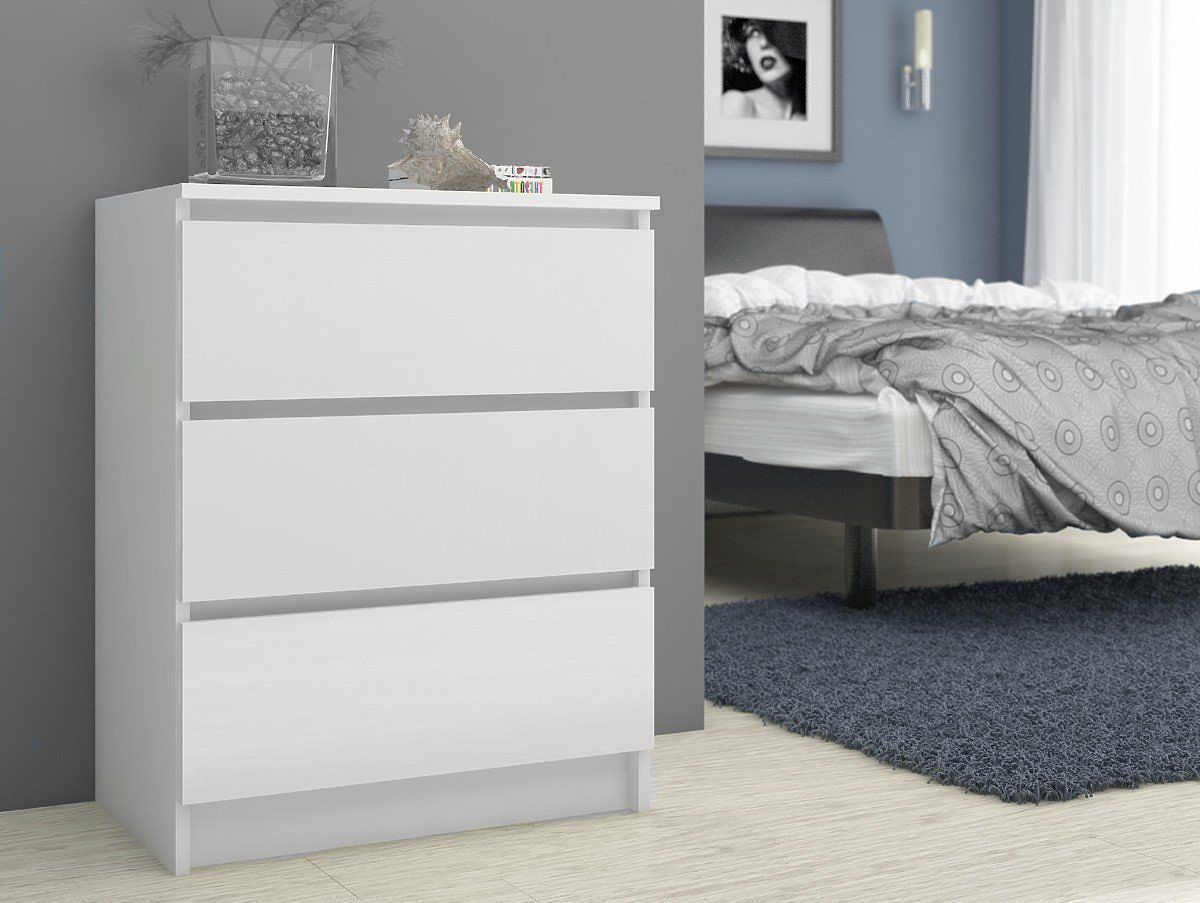 Lepota je v preprostosti, kar se dobro zavedamo, zato vam ponujamo najlepše pohištvo za sobe. Eden izmed naših predlogov je učinkovita bela komoda 60 cm, ki bo zagotovo navdušila ljubitelje skandinavskega stila. Belo pohištvo je v zadnjem času zelo priljubljeno - ni čudno: združuje praktično uporabo, univerzalnost in privlačen videz. Bela komoda s 3 predali je predlog, ki se odlično prilega dnevnim sobam, spalnicam, otroškim in gostinskim sobam, jedilnicam in mnogim drugim prostorom. Uspešno jo lahko uporabite tudi v pisarni. Trije praktični predali zlahka sprejmejo vse potrebne predmete. Komoda je izdelana iz 16 mm laminirane plošče, ki se odlikuje po povečani odpornosti proti obrabi. Robovi so oblepljeni z ABS trakom. Priporočamo, da izkoristite našo ponudbo.