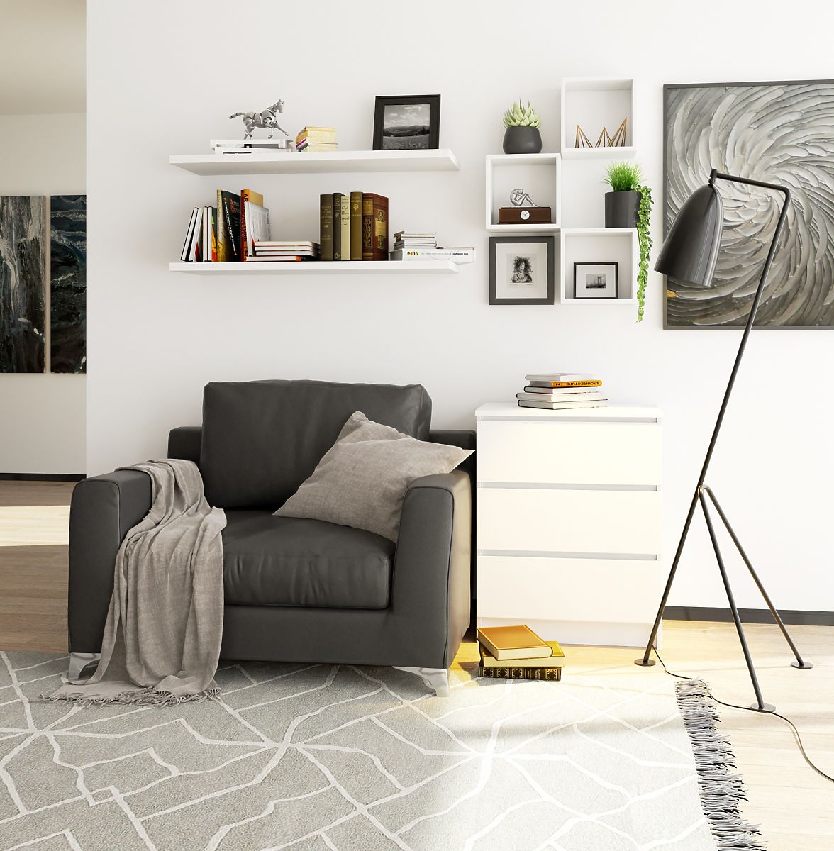 Bela komoda s tremi predali za skandinavski stil. .. več