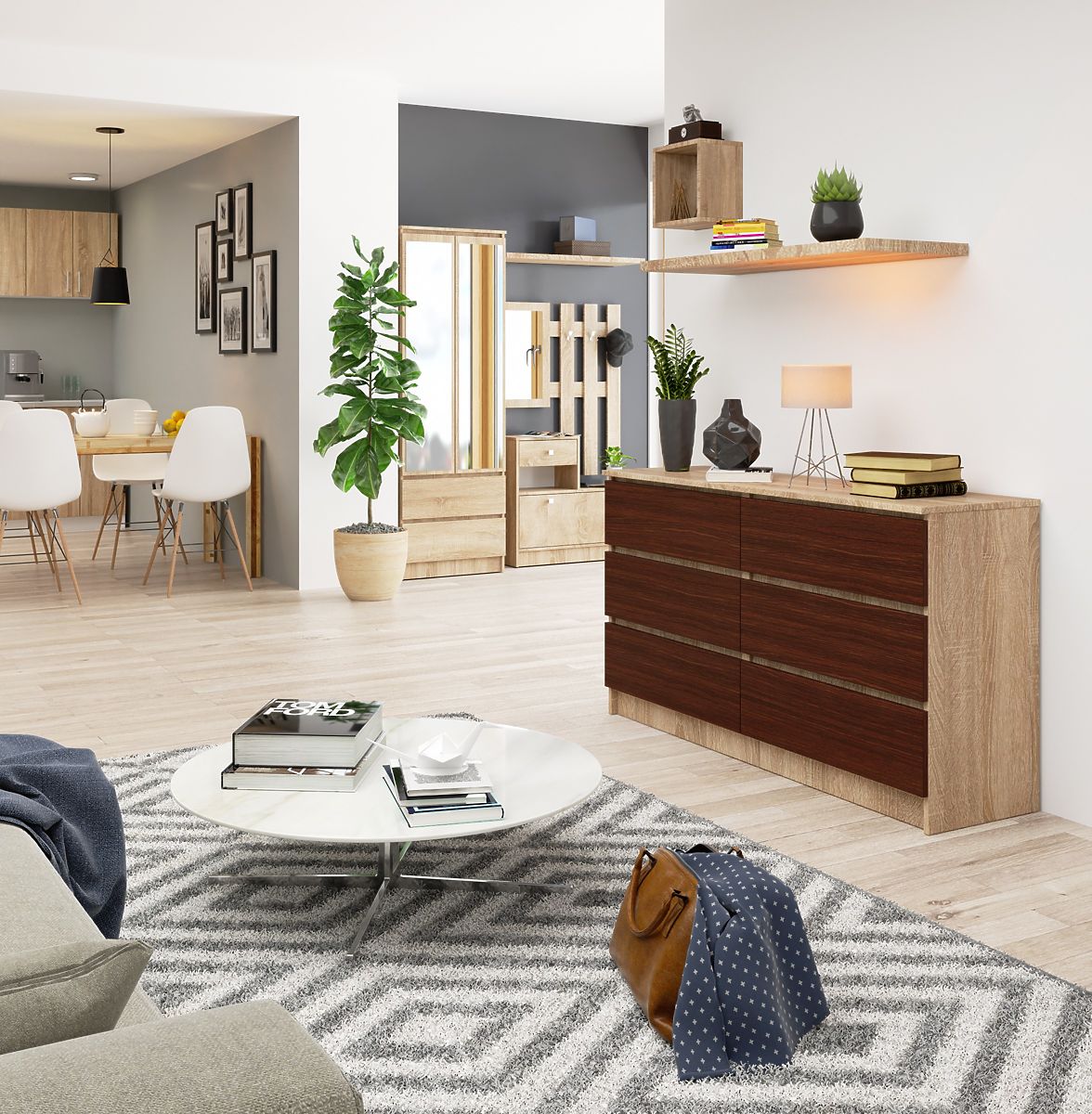 Široka komoda je kombinacija dveh klasično lepih odtenkov lesa, wenge in sonoma. Ti barvi sta v zadnjih letih zelo priljubljeni in ni presenetljivo, da uživata veliko zanimanje med kupci naše spletne trgovine. Če iščete funkcionalno in kakovostno komodo - ste na pravem mestu. Pohištvo je sestavljeno iz šestih predalov, izdelanih iz odporne laminirane plošče - materiala, odpornega proti obrabi in poškodbam.