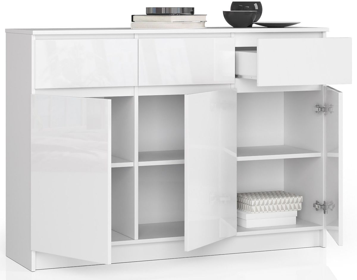 Komoda z belimi sijajnimi frontami in tremi predali. .. več