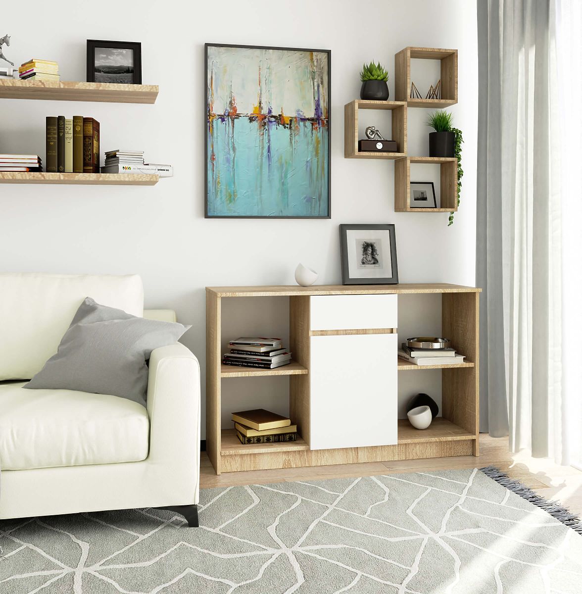 Pametna zasnova komode B-17 jo naredi primerno za prostore, kot so dnevna soba, spalnica, predsoba ali garderoba. Združuje odprte police z zaprtim omarico in predalom. Predal ima možnost blokade, kar omogoča shranjevanje dragocenih stvari. Je odličen prostor za shranjevanje drobnarij, spominkov in različnih dekoracij. Kombinacija bele in svetlega lesa jo naredi primerno za sodobne aranžmaje.