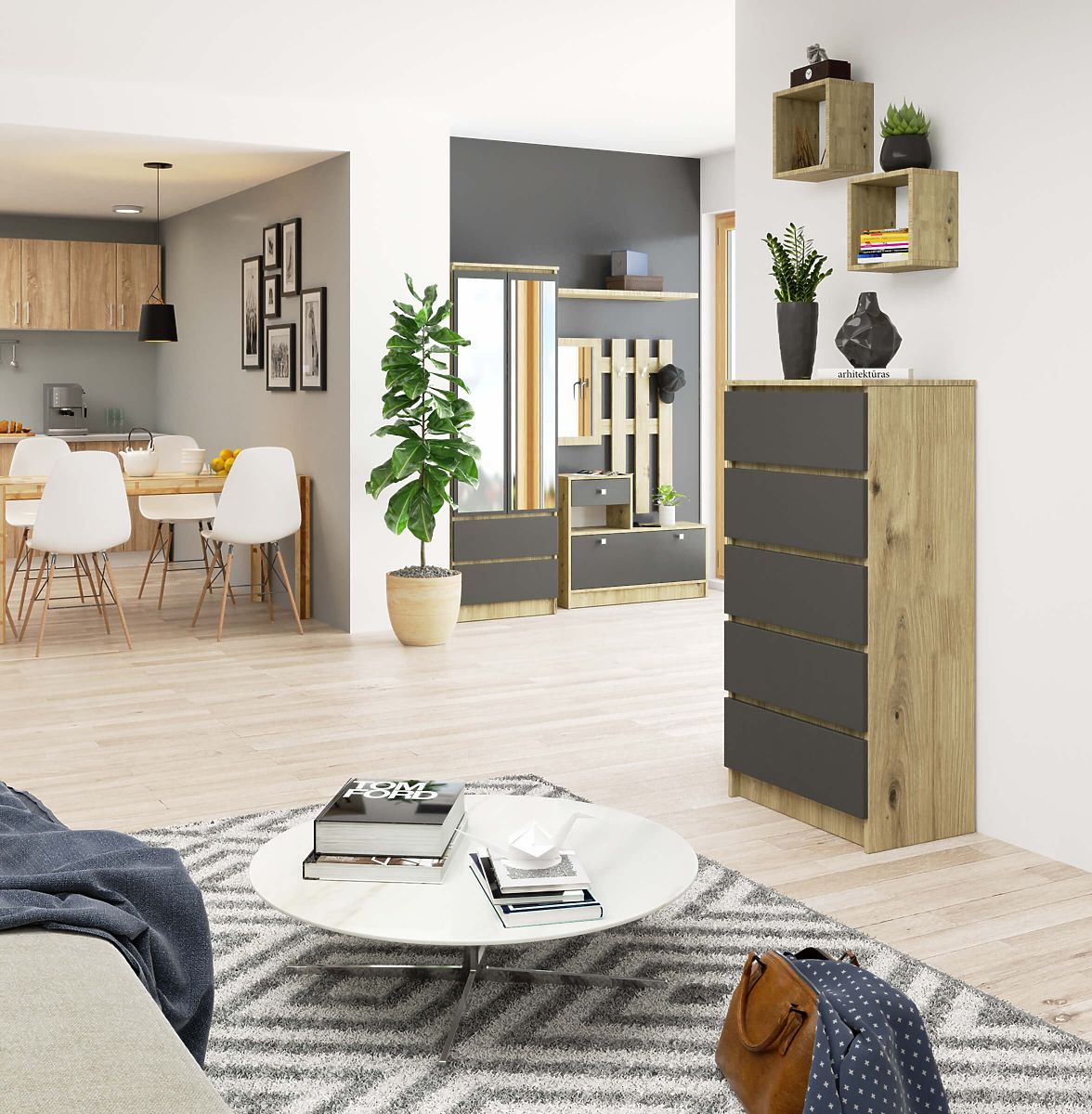 Komoda s petimi predali v barvi hrasta in sivega grafita. .. več