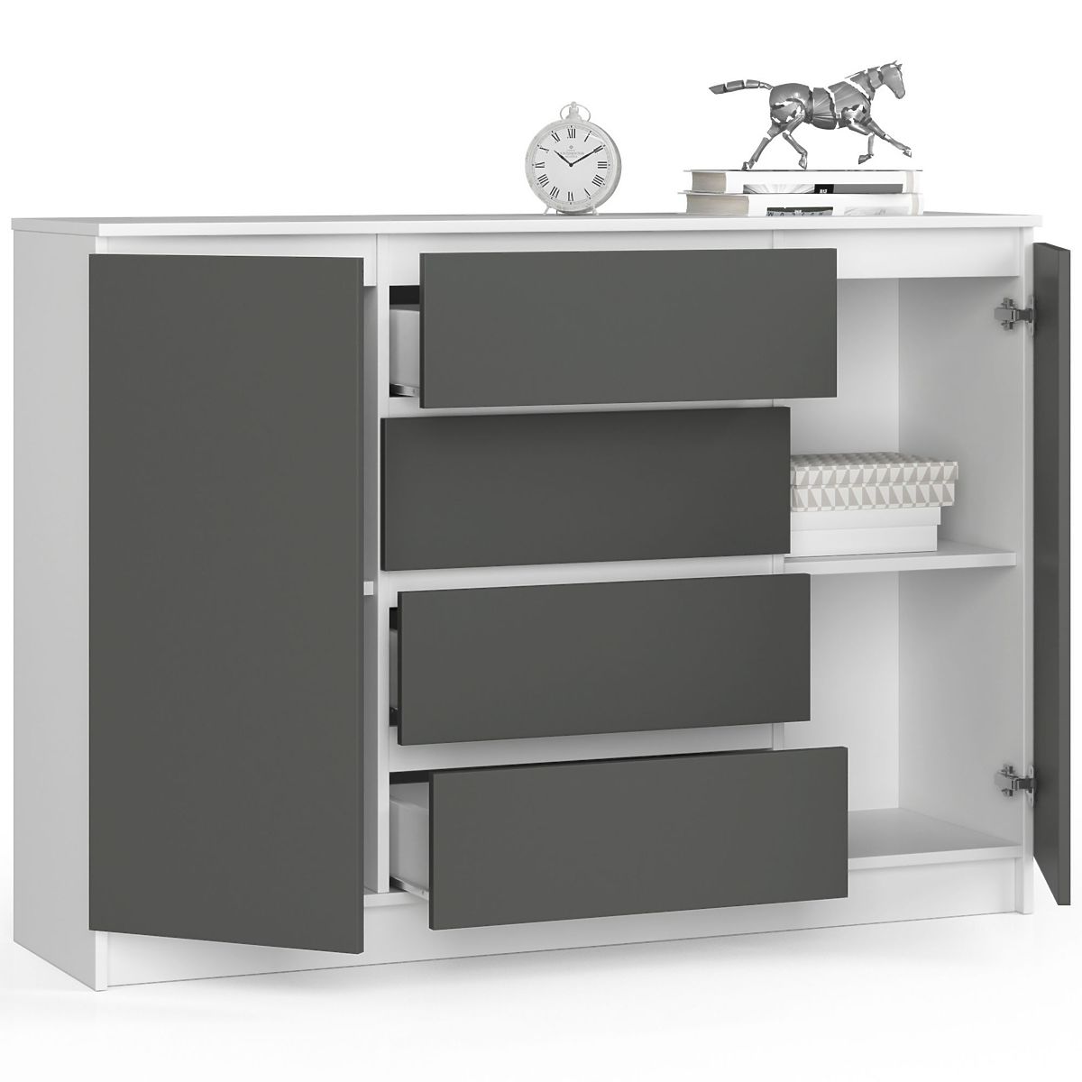 Komoda z dvema vratoma in štirimi predali v beli in sivi barvi. .. več