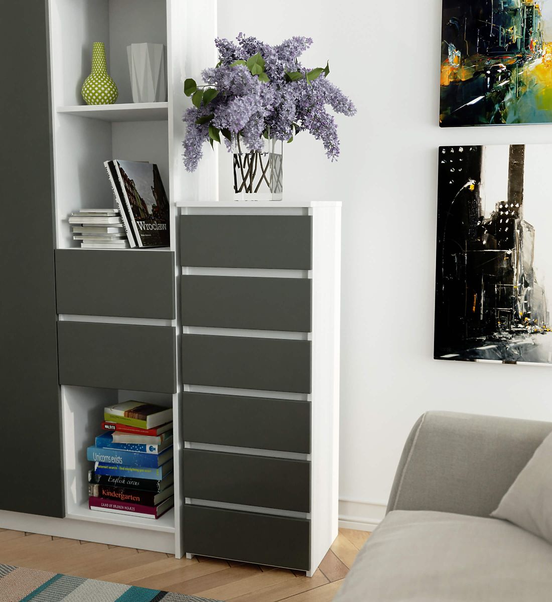 Komode so priljubljen tip pohištva, ki se postavlja poleg postelje. Na vrhu se najpogosteje nahaja svetilka, znotraj pa predmeti, ki olajšajo počitek in spanje. Tisti, ki iščejo elegantno komodo, naj bodo pozorni na komodo CL6 40 cm v beli barvi z grafitno sivimi čeli. Lepo se bo podala v vsako spalnico. Lahko se postavi tudi v otroško sobo.