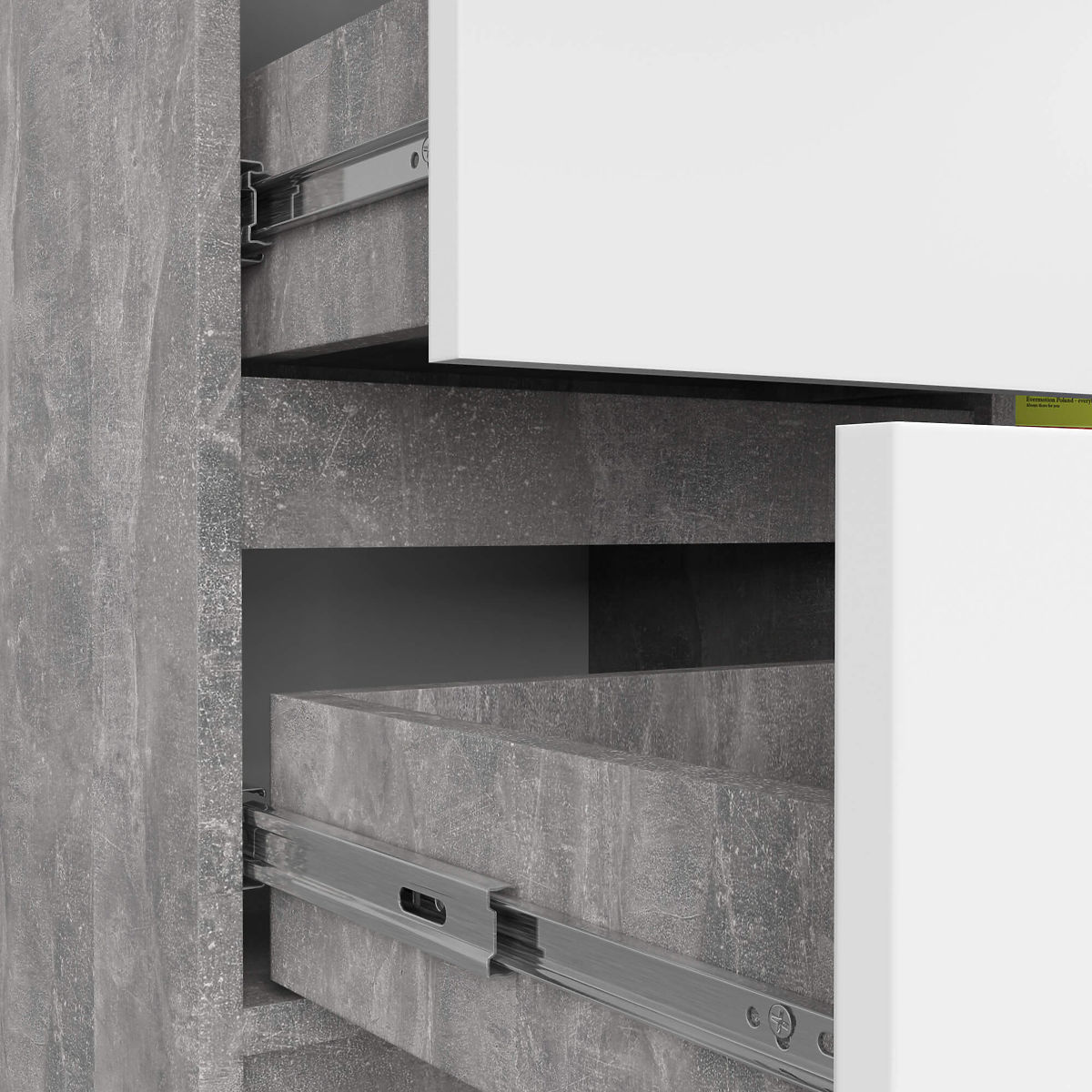 Majhna komoda je kos pohištva, ki bo našel svoje mesto v vsakem prostoru. Sodobne barve, trdna konstrukcija in skrbna izdelava so pripeljale do ustvarjanja omarice, ki se bo izkazala na primer v predsobi, dnevni sobi ali mladinski sobi, pa tudi v spalnici. Uporablja se lahko tudi v pisarniških prostorih, kjer omogoča shranjevanje številnih dokumentov in drugih pisarniških potrebščin. Komoda je sestavljena iz enih vrat (z dvema policama znotraj) in 3 predalov. Pohištvo združuje barve betona in bele.