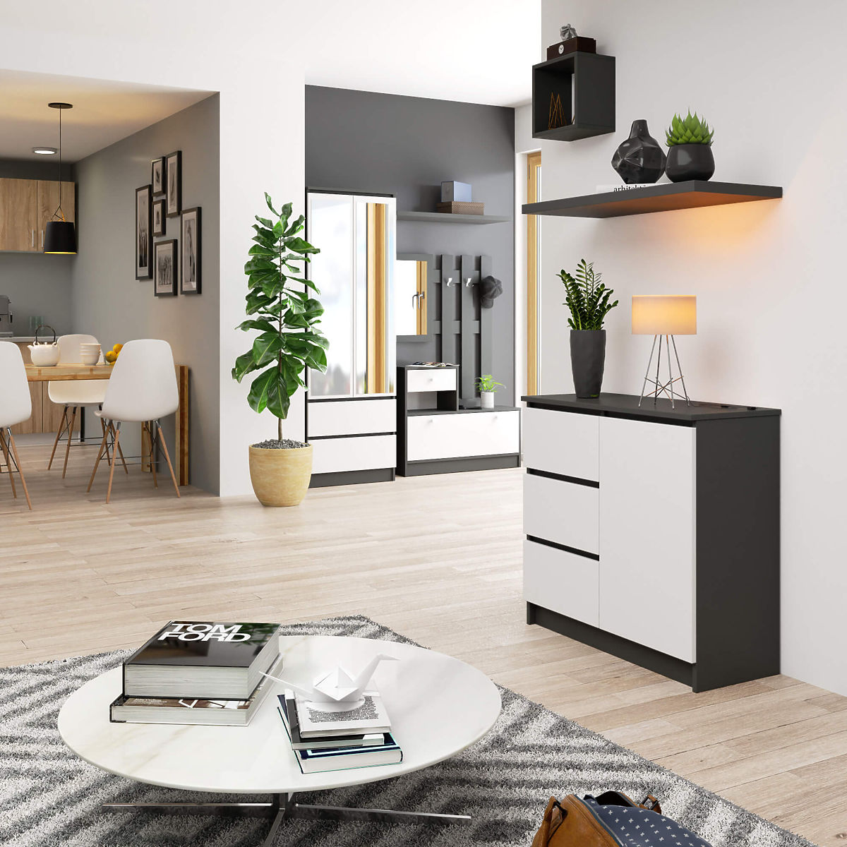 Majhna komoda je kos pohištva, ki bo našel mesto v vsakem prostoru. Sodobne barve, trdna konstrukcija in skrbna izdelava so privedli do nastanka omarice, ki se bo izkazala na primer v predsobi, dnevni ali otroški sobi, pa tudi v spalnici. Lahko se uporablja tudi v pisarniškem prostoru, kjer omogoča shranjevanje številnih dokumentov in drugih pisarniških potrebščin. Komoda je sestavljena iz enih vrat (znotraj sta dve polici) in 3 predalov. Pohištvo združuje barve grafitno sive in bele.