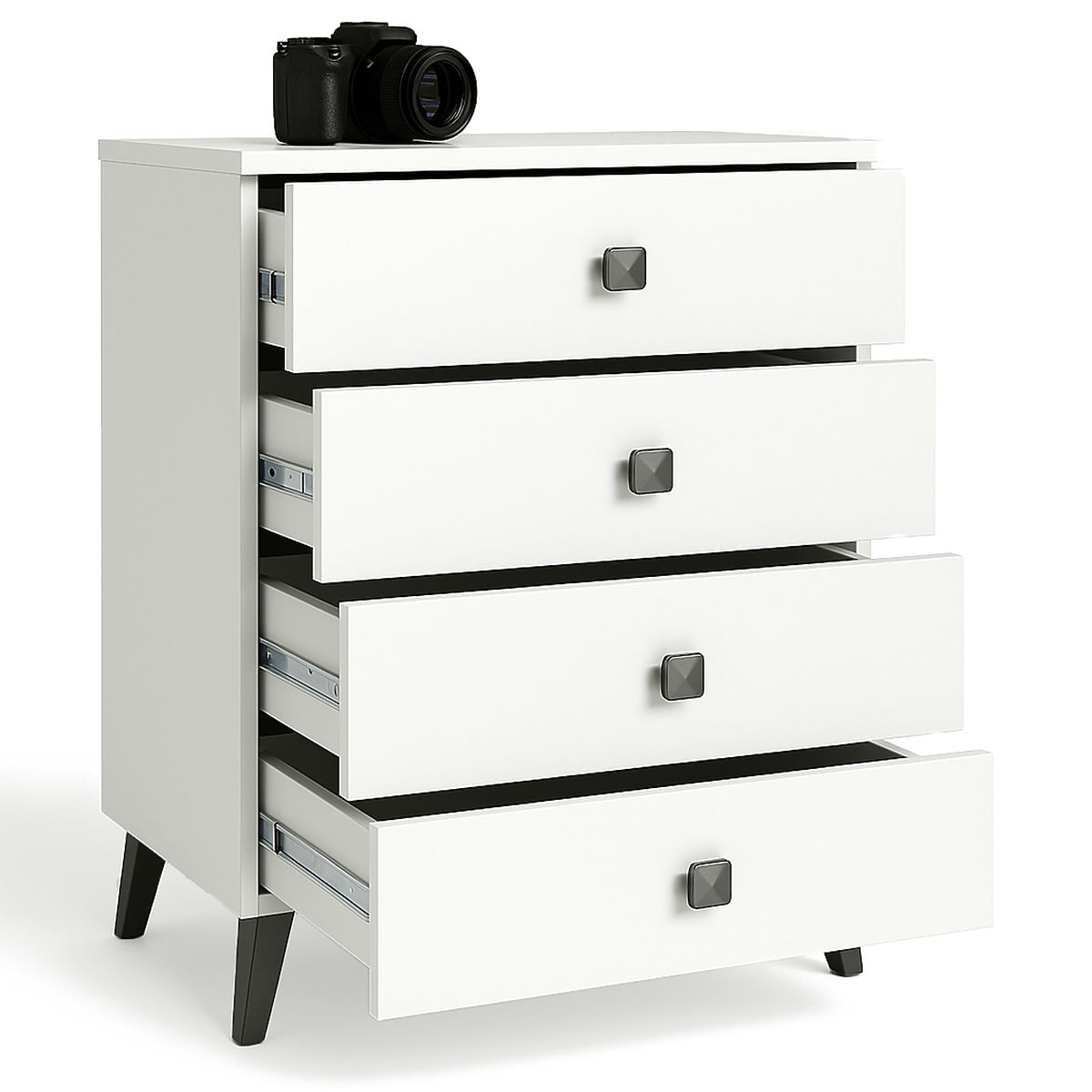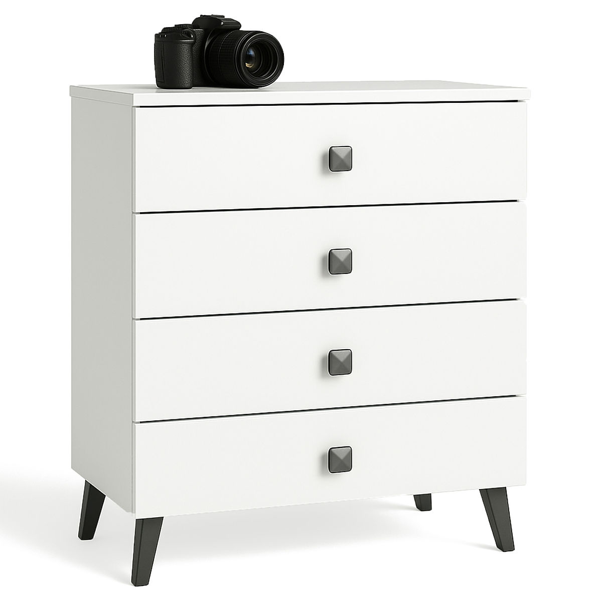 Majhna komoda je kos pohištva, ki najde mesto v vsakem prostoru. Sodobne barve, trdna konstrukcija in skrbna izdelava so pripeljale do ustvarjanja omarice, ki se prilega na primer v predsobo, dnevno ali otroško sobo, pa tudi v spalnico. Uporablja se lahko tudi v pisarniških prostorih, kjer omogoča shranjevanje številnih dokumentov in drugih pisarniških potrebščin. Komoda je sestavljena iz 4 predalov. Pohištvo združuje belo in črno barvno shemo.