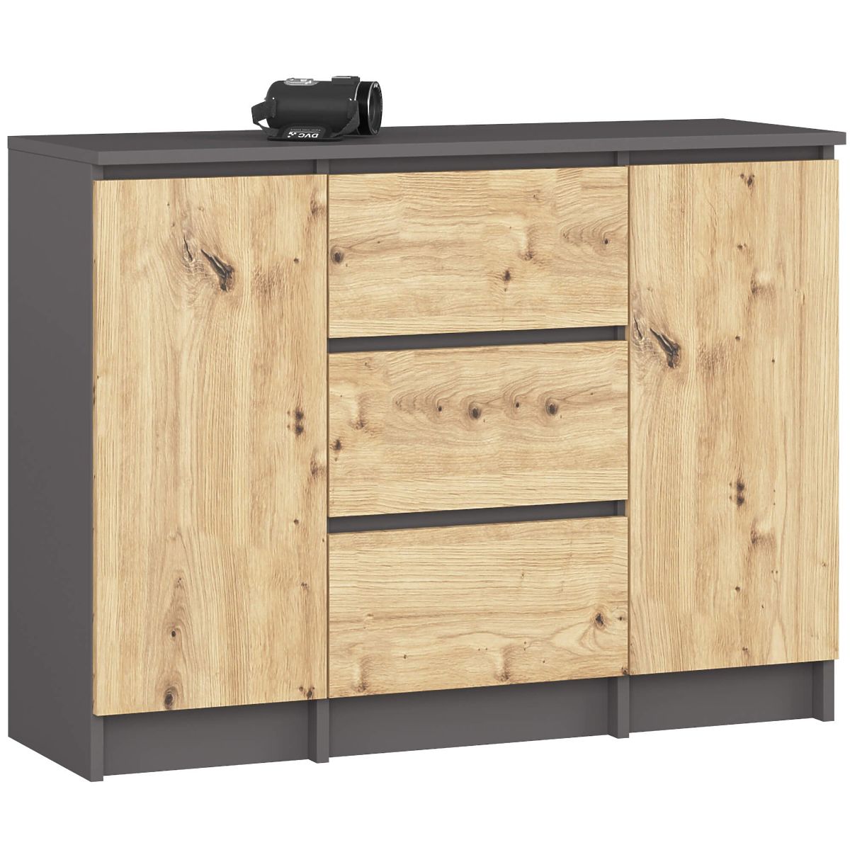 Komoda z dvema vrati in tremi predali v grafit sivi in hrast artisan barvi. .. več