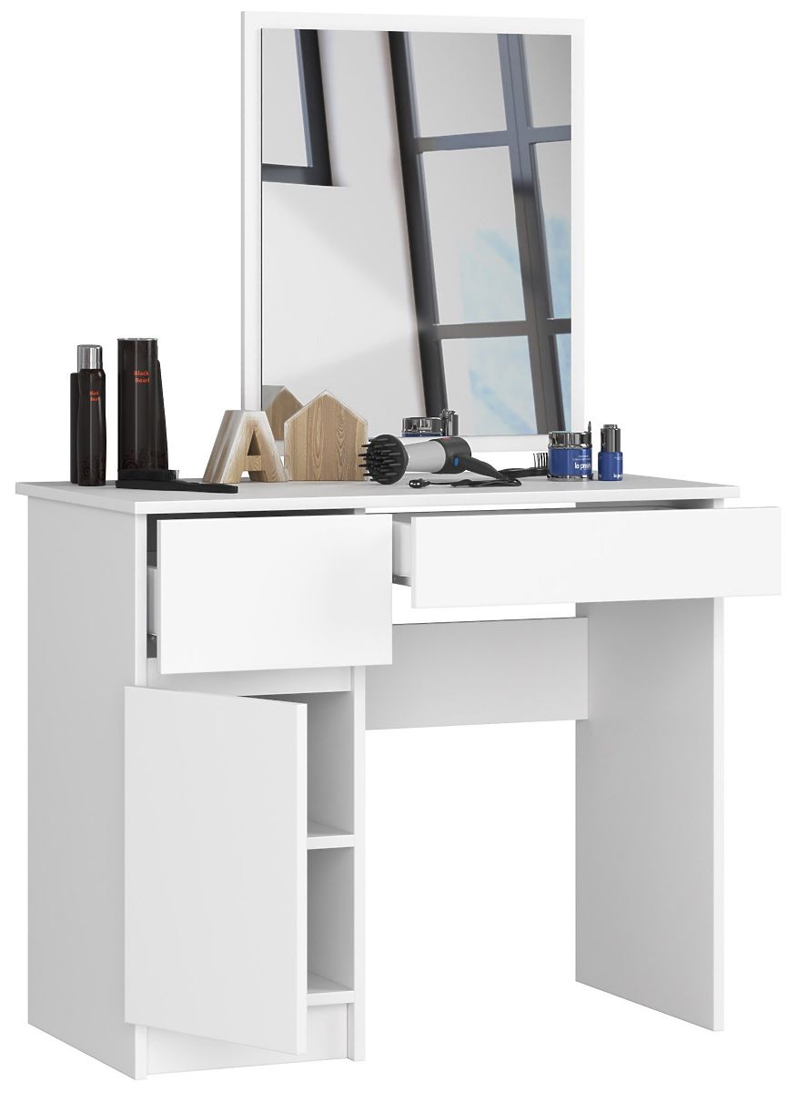 Toaletna mizica z ogledalom v beli barvi z predali in prostornim prostorom za vrati. Levična konfiguracija.
