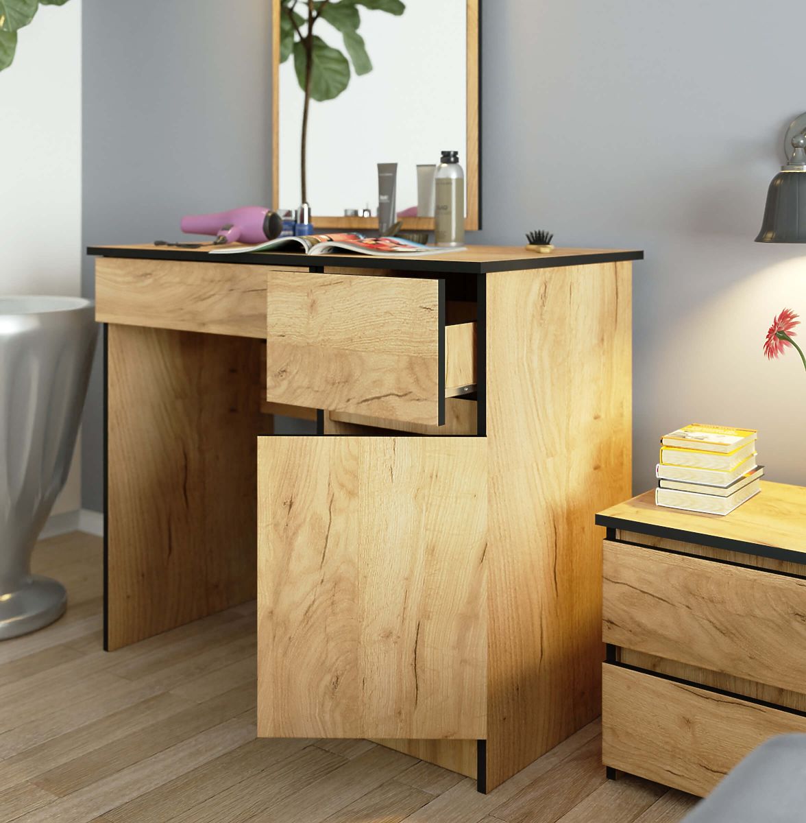 Kozmetična toaletna miza z ogledalom v barvi hrast craft s predali in prostornim mestom za vrati.
