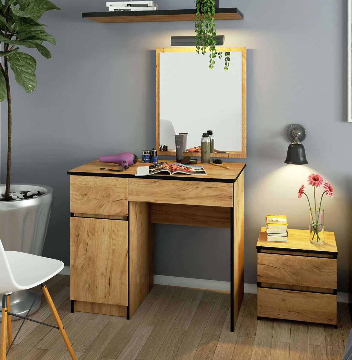 Toaletna miza z ogledalom v barvi hrast craft z predali in prostornim mestom za vratci. Konfiguracija levo.
