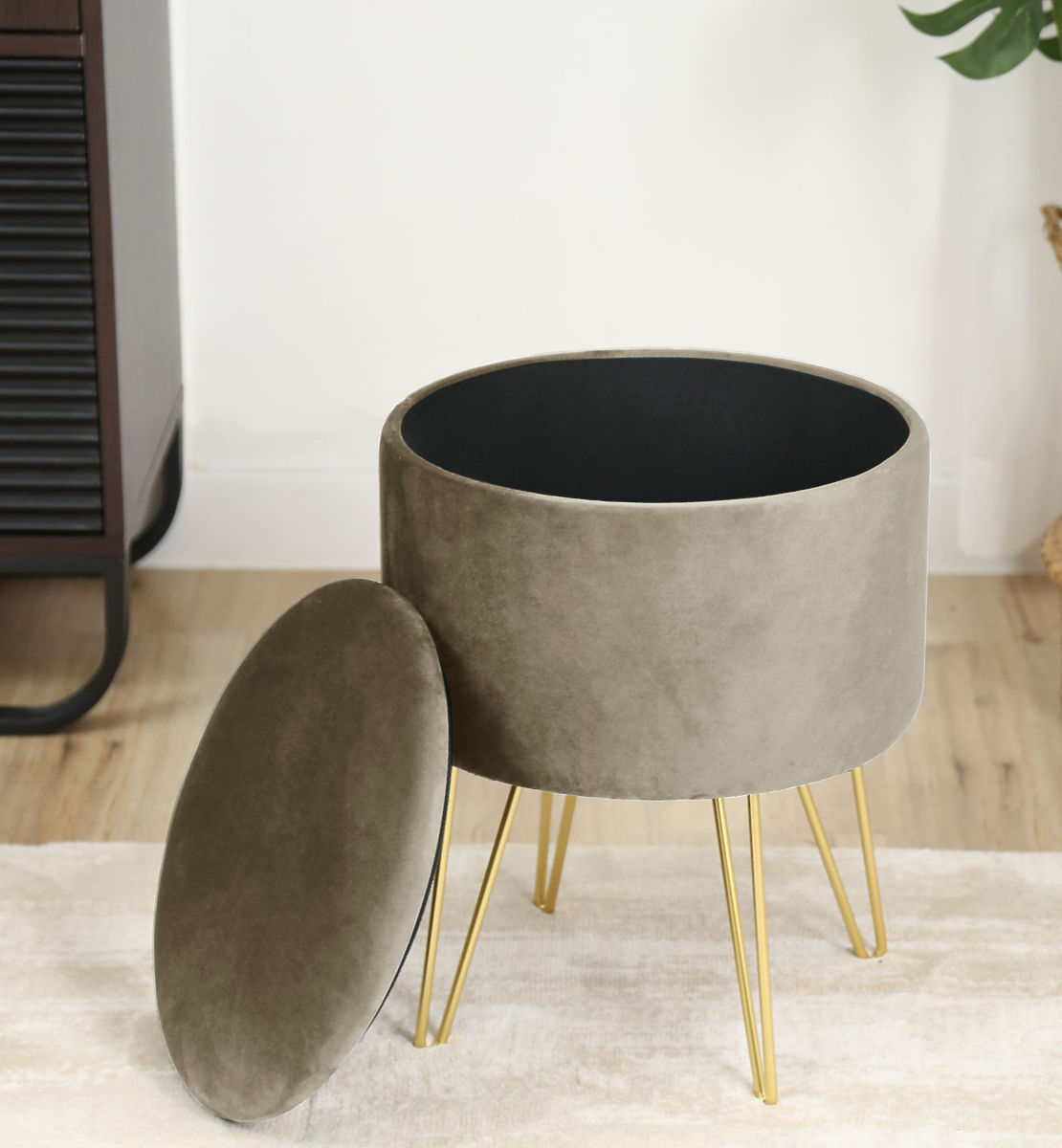 Podnožnik ali pufa je odličen dodatek za dnevno sobo ali spalnico. Omogoča počitek utrujenim nogam po celodnevni hoji, in če je pufa izdelana iz mehkega velurja, to še poveča prijetne občutke počitka. Sodobni videz dopolnjujejo kovinske noge, pobarvane v zlato barvo, ki je letos tako modna. Odpiralni pokrov omogoča dostop do odlagalnega prostora, kamor lahko shranite predmete, ki niso potrebni za vsakodnevno uporabo.Specifikacije: