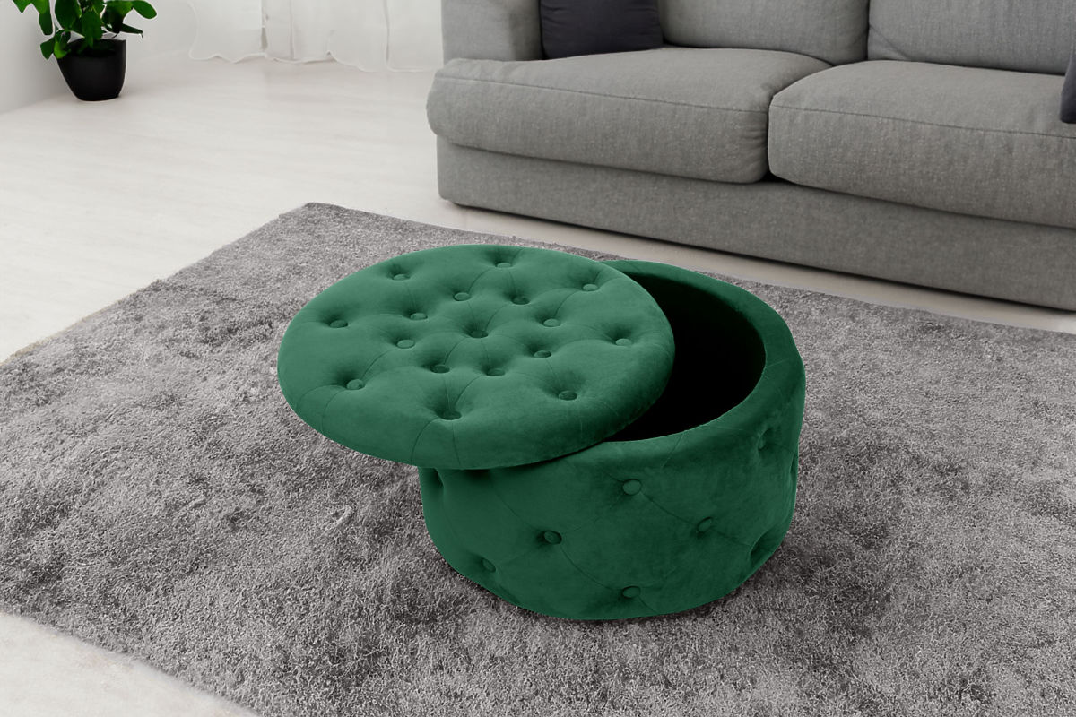 Podnožnik ali pufa je odličen dodatek za dnevno sobo ali spalnico. Omogoča počitek utrujenim nogam po celem dnevu hoje, in če je pufa izdelana iz mehkega velurja, le še povečuje prijetne občutke počitka. Moderen videz dopolnjujejo prešivi, ki naši pufi dajejo eleganten stil. Odprto pokrov omogoča dostop do shranjevalnega prostora, kamor lahko shranimo predmete, ki jih ne potrebujemo za vsakodnevno uporabo.Specifikacije: