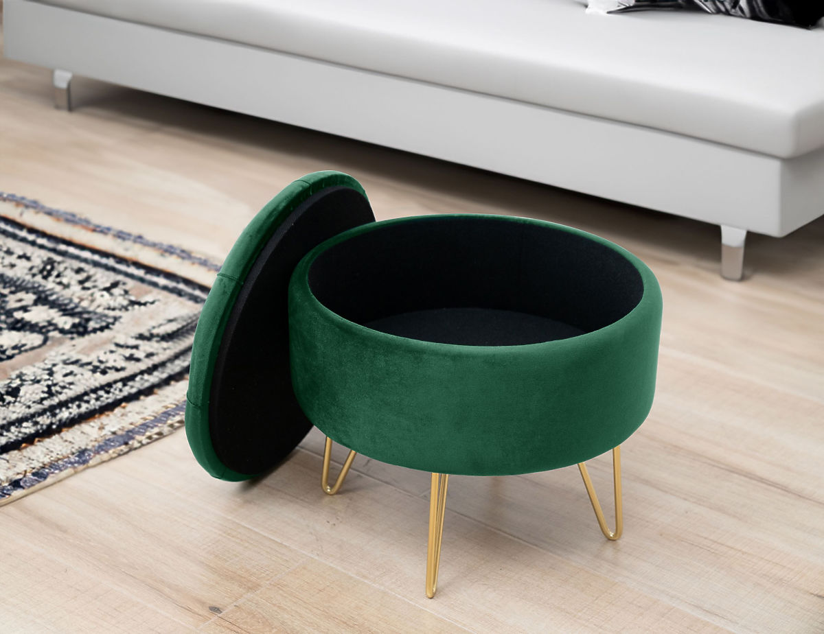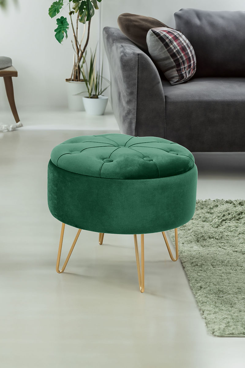 Podnožnik ali puf je odličen dodatek za dnevno sobo ali spalnico. Z njim si lahko utrujene noge po celodnevni hoji odpočijejo, in če je puf izdelan iz mehkega velurja, to le še poveča prijetne občutke počitka. Sodobni videz dopolnjujejo kovinske noge, pobarvane v zlato barvo, ki je letos tako modna. Odprto pokrov omogoča dostop do shranjevalnega prostora, kamor lahko shranite predmete, ki niso potrebni za vsakodnevno uporabo.Specifikacije: