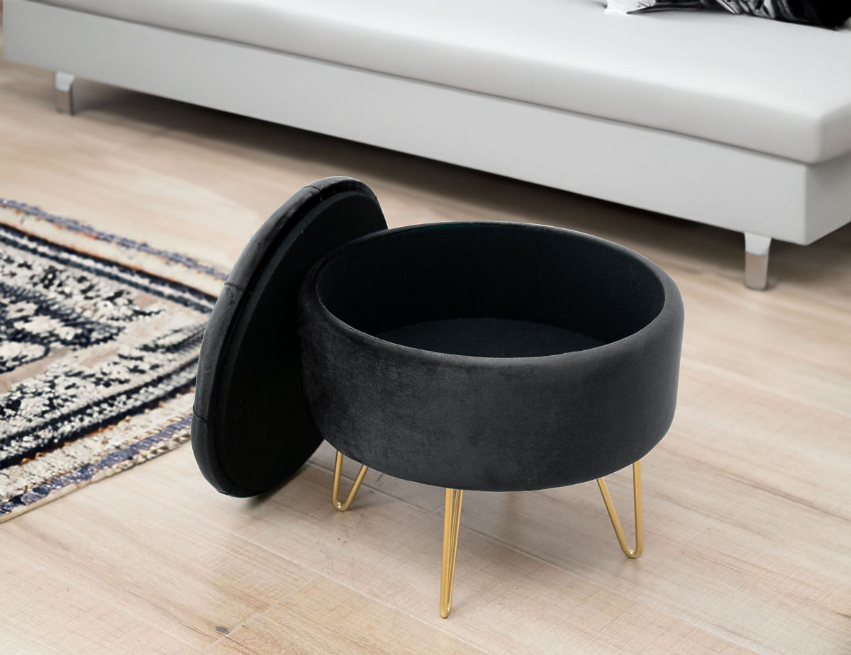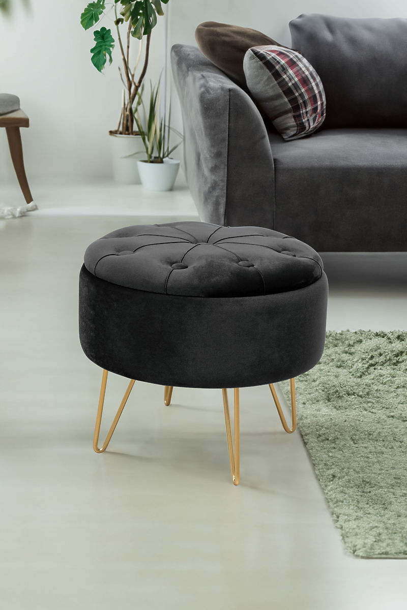 Podnožnik ali pufa je odličen dodatek za dnevno sobo ali spalnico. Omogoča počitek utrujenim nogam po celodnevni hoji, in če je pufa narejena iz mehkega velurja, to le še poveča prijetne občutke počitka. Sodobni videz dopolnjujejo kovinske noge, pobarvane v zlato barvo, ki je letos tako modna. Odstranljiv pokrov omogoča dostop do odlagalnega prostora, kamor lahko shranite predmete, ki jih ne potrebujete vsak dan.Specifikacije: