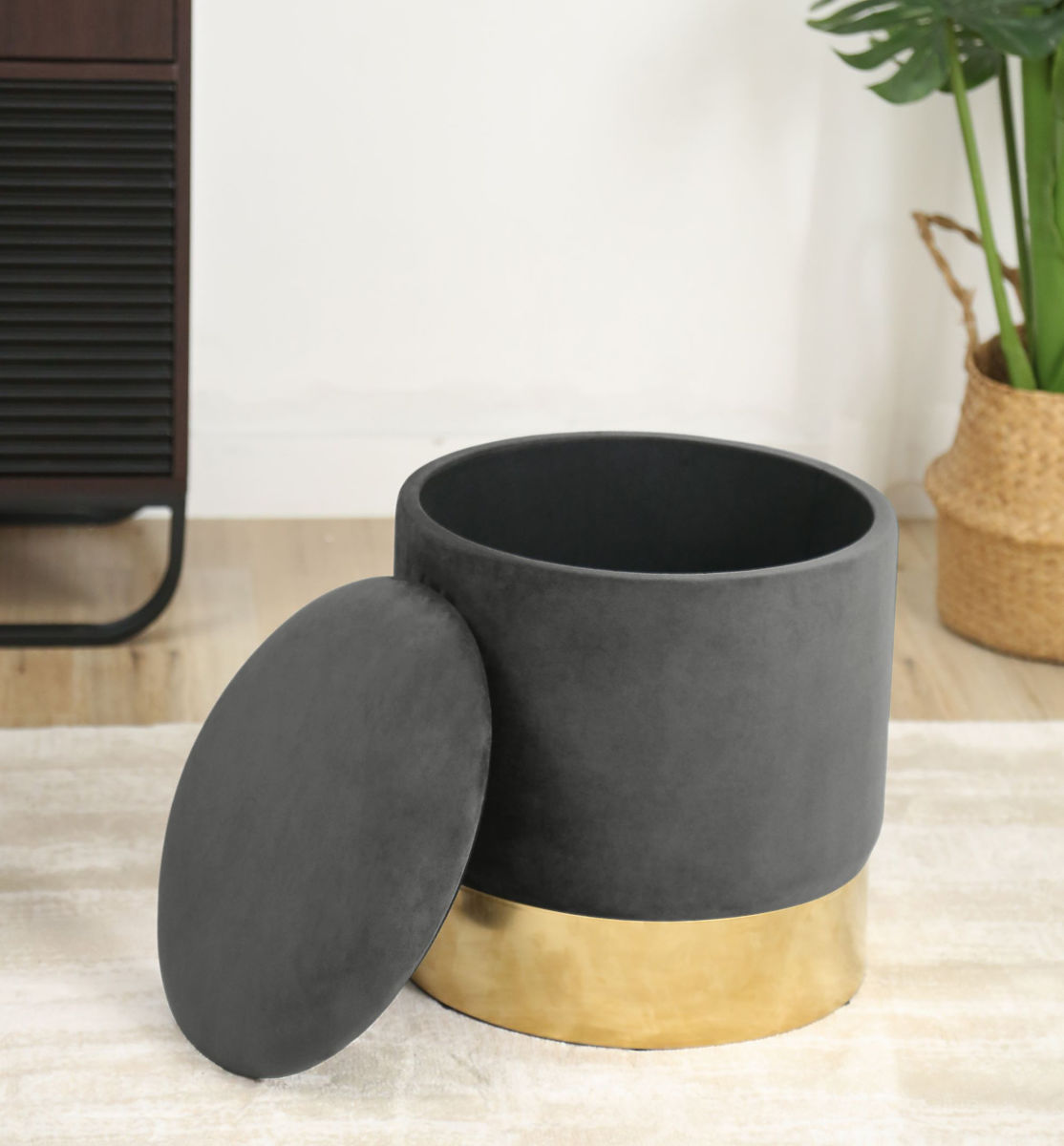 Puf z možnostjo shranjevanja na kovinskem podstavku zlate barve.