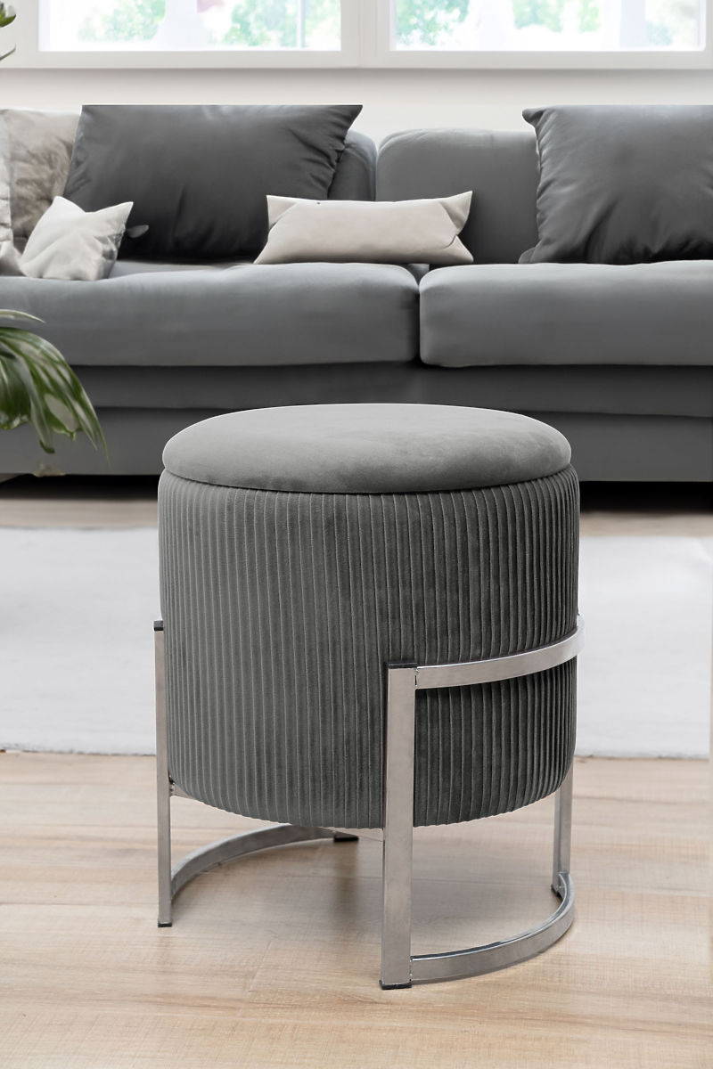 Pručka ali puf je odličen dodatek za dnevno sobo ali spalnico. Z njim si lahko utrujene noge po celodnevnem hoji odpočijejo, in če je puf izdelan iz mehkega velurja, to le še poveča prijetne občutke počitka. Sodobni videz dopolnjujejo elementi, v našem pufu smo uporabili kovinsko osnovo srebrne barve. Odprto pokrov omogoča dostop do odlagalnega prostora, kamor lahko shranite predmete, ki niso potrebni za vsakodnevno uporabo.Specifikacije:
