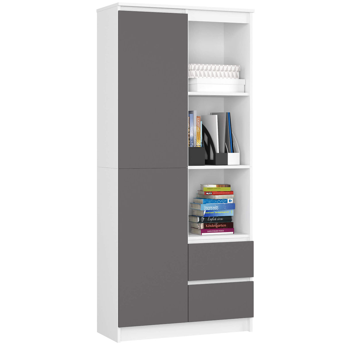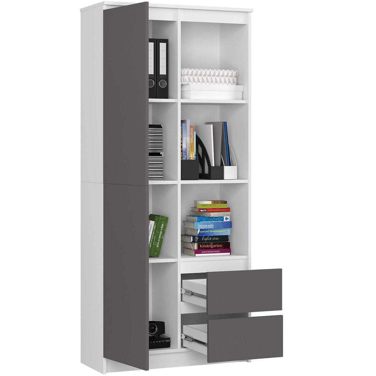 Pisarniški regal z vrati in predali v kombinaciji bele in grafitno sive barve.