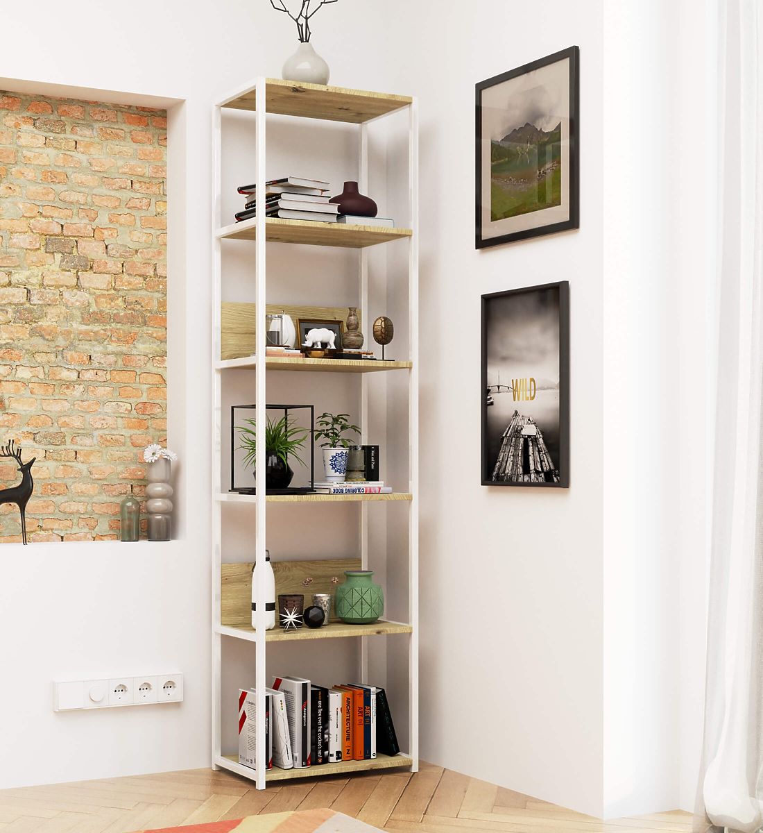 Kovinski loft regal je praktično in moderno pohištvo, ki se prilega tako dnevni sobi kot pisarni. Regal z belim kovinskim okvirjem in 6 policami v barvi Hrast Artisan. Police regala so izdelane iz laminirane plošče debeline 16 mm. To je trpežen in odporen material, ki se odlikuje po visoki odpornosti proti obrabi. Robovi so dodatno zaščiteni z ABS robom, kar zagotavlja, da bo pohištvo še vedno dobro izgledalo tudi pri zelo intenzivni vsakodnevni uporabi. Regal je opremljen s 6 policami, na katere lahko postavimo predmete, ki jih želimo razstaviti ali imeti preprosto pri roki. Celoten videz je zelo stilski in moderen.