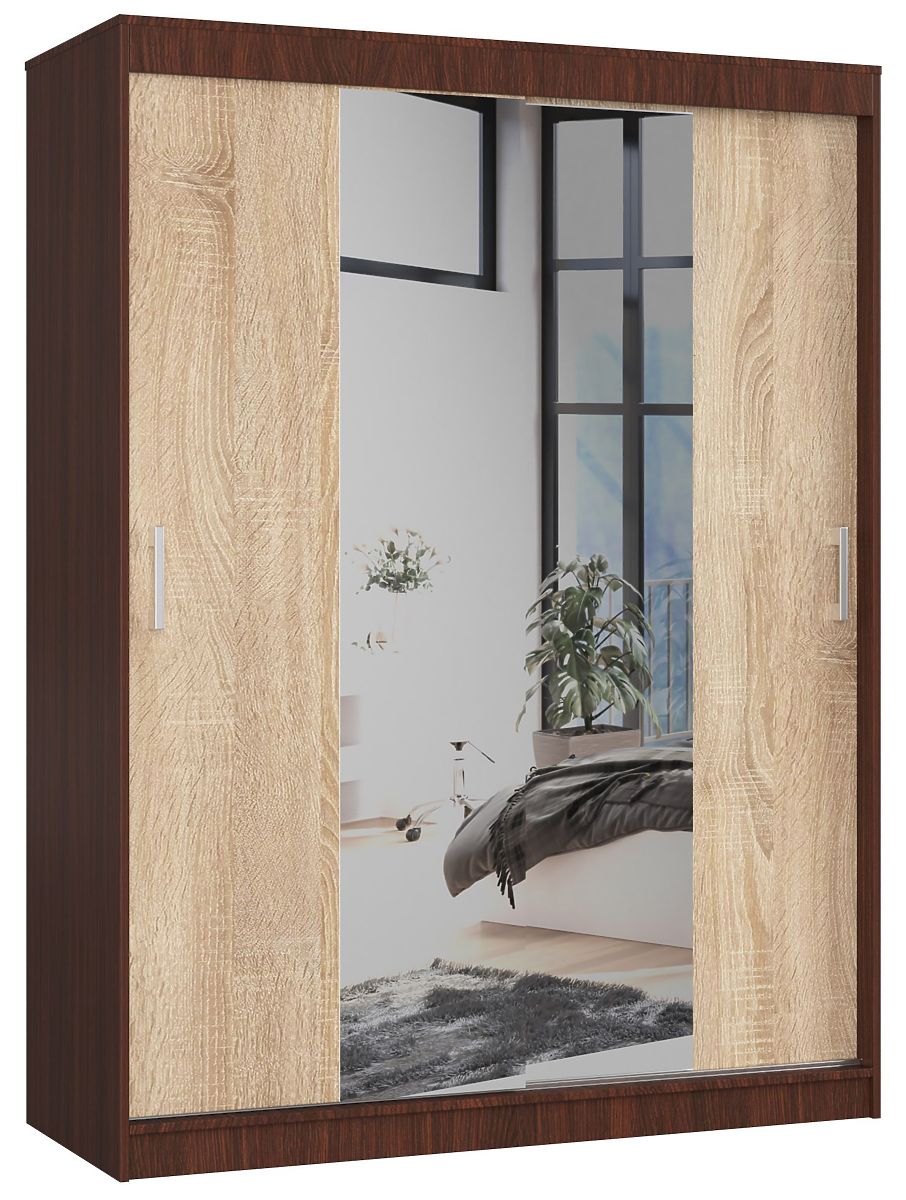 Velika omara z drsnimi vrati zlahka sprejme vsa oblačila, obutev, torbice in številne druge potrebne stvari v spalnici ali predsobi. Predstavljeni model 150 cm CLP z ogledalom je namenjen ljubiteljem vedno priljubljene barvne kombinacije wenge/sonoma. Pohištvo odlikuje visoka kakovost izdelave iz kakovostnih, trpežnih in odpornih materialov. To je predlog, ki ga lahko pogumno uporabite ne le v bivalnem prostoru, temveč tudi na primer v pisarni. Omara se najpogosteje uporablja v spalnicah, kjer omogoča shranjevanje predvsem oblačil - tako na številnih policah kot na praktični palici.