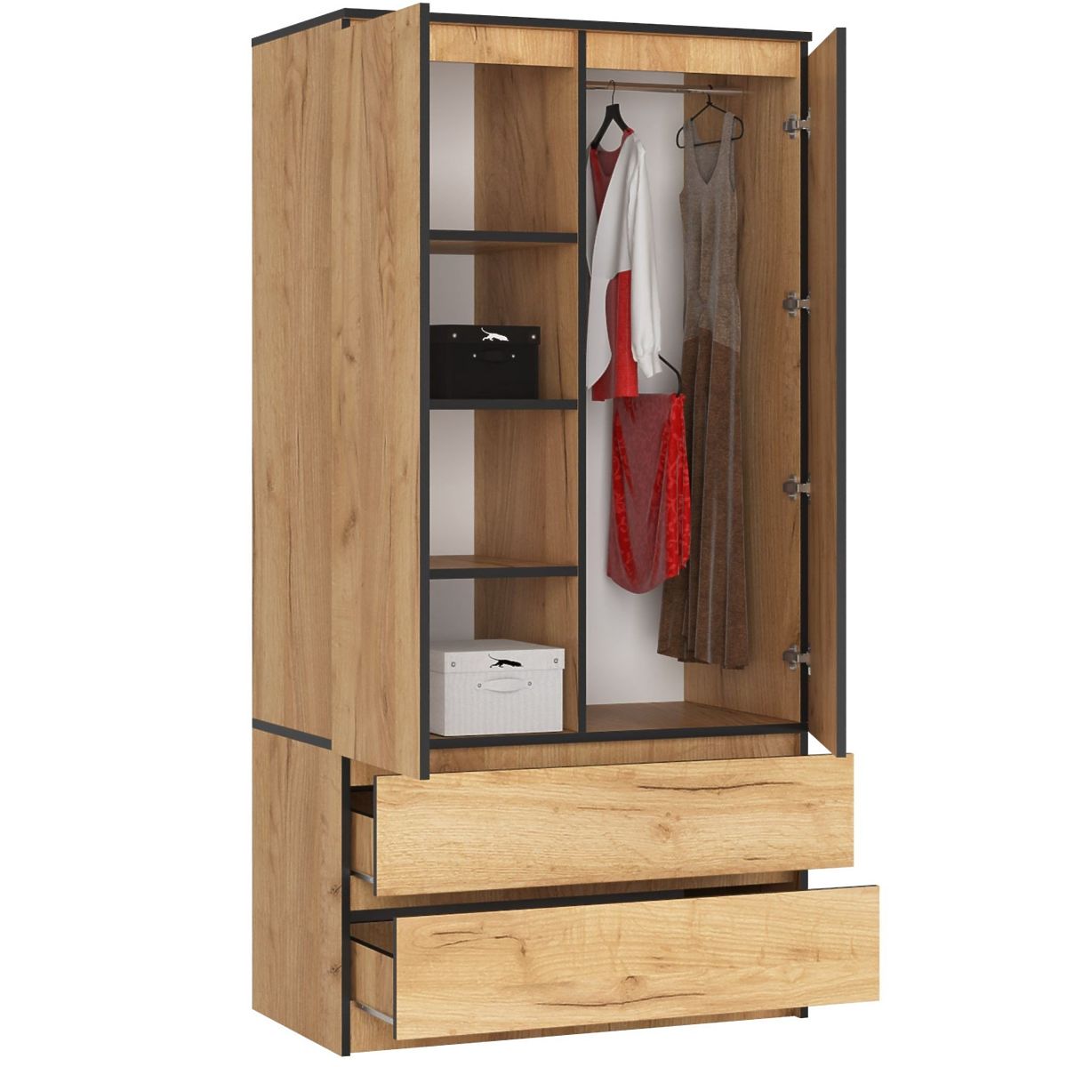 Dvovratna garderobna omara je izdelana iz odporne laminirane plošče. Korpus pohištva je v celoti v barvi hrast craft. Spodnji del omare sestavljata dve predali, nameščeni vzporedno nad seboj, medtem ko je zgornji, višji segment razdeljen na dva dela. Levi del vsebuje vrsto 4 polic, medtem ko je desni, opremljen s palico, namenjen za obešanje oblačil.