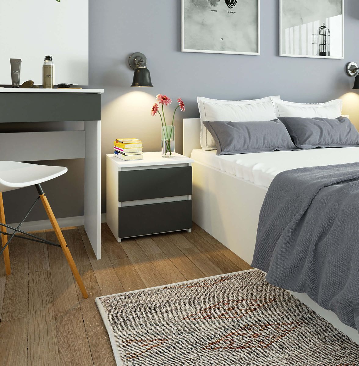 Nočne omarice so priljubljena vrsta pohištva, ki se postavlja poleg postelje. Na njeni plošči lahko postavite svetilko, v predale pa pomembne predmete, ki izboljšujejo kakovost počitka in spanja. V naši ponudbi je na voljo bela nočna omarica CL2 40 cm s sprednjimi stranmi predalov v barvi grafit siva. Deluje elegantno in moderno, hkrati pa je funkcionalna. Odlično se prilega vsaki spalnici in mladinski sobi.