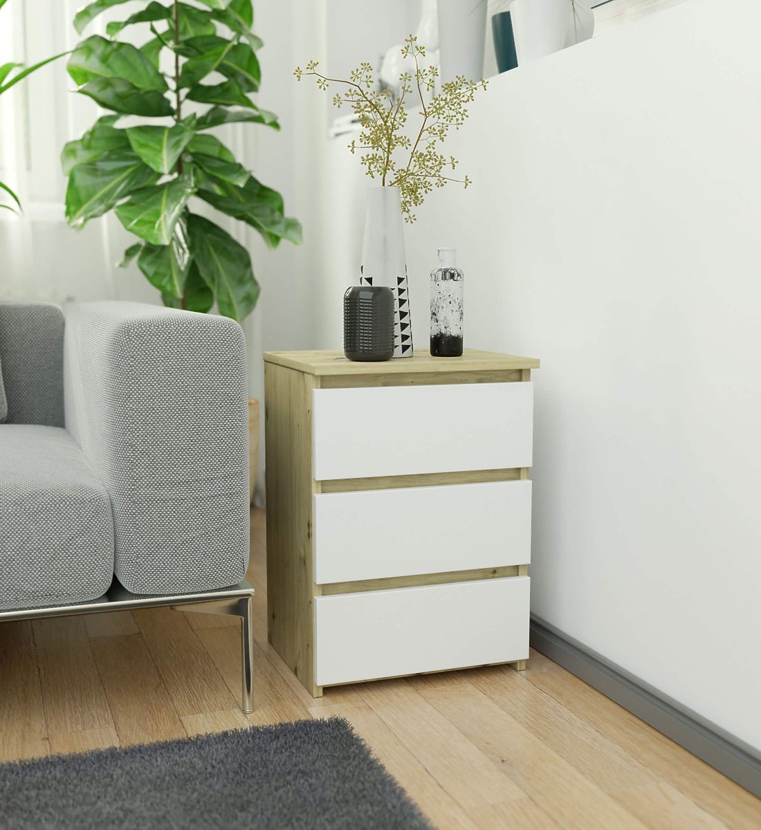 Nočna omarica CL3 40 cm z 3 predali v hrastu artisan in beli barvi. .. več