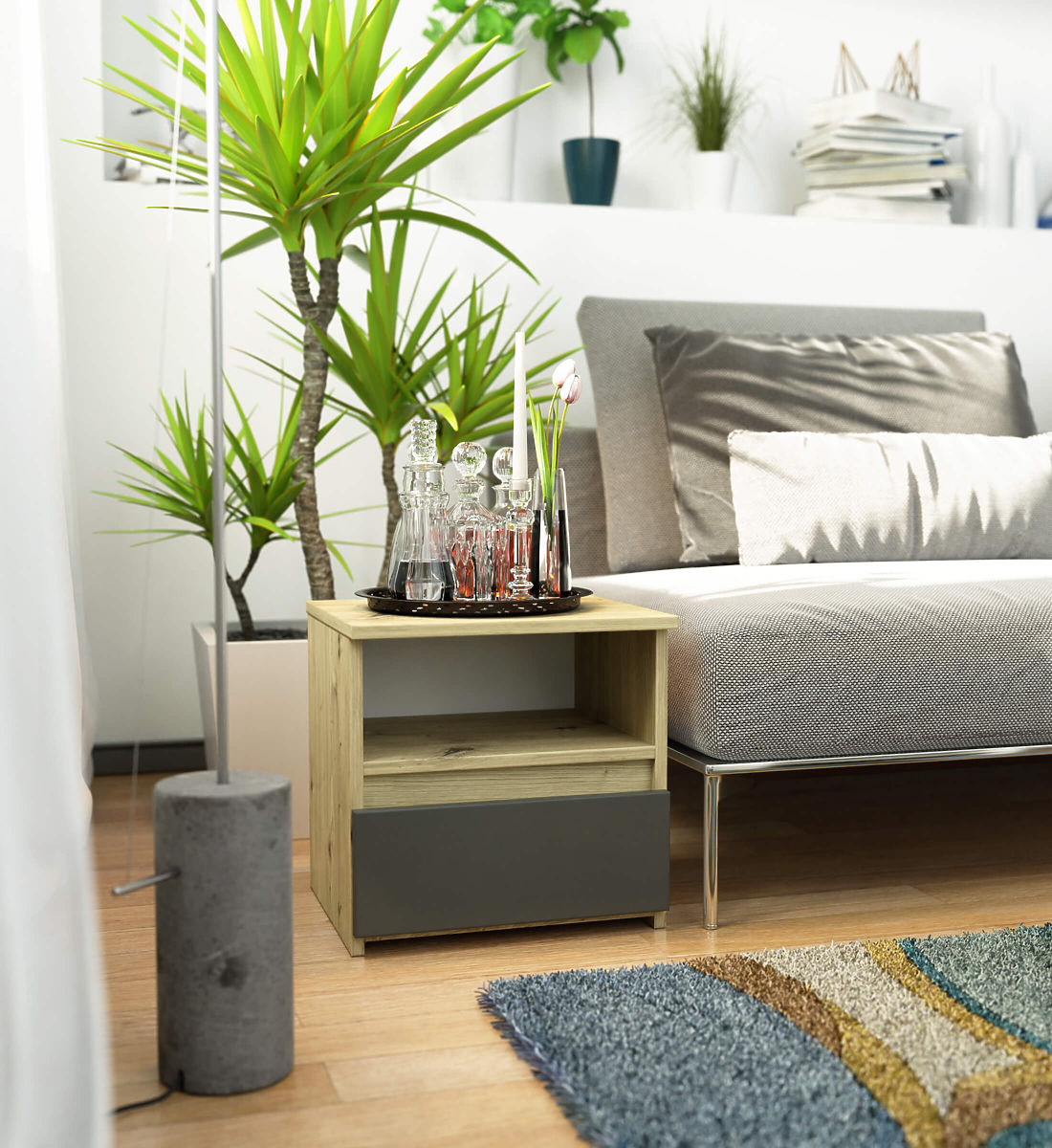 Nočne omarice so priljubljena vrsta pohištva, ki se postavlja poleg postelje. Na njeni plošči je najpogosteje svetilka, v notranjosti pa predmeti, ki olajšajo počitek in spanje. Osebe, ki iščejo elegantno komodo, naj bodo pozorne na nočno omarico CL1 40 cm v barvi hrast artisan grafit siva. Čudovito se bo podala v vsako spalnico. Lahko jo postavite tudi v otroško sobo.