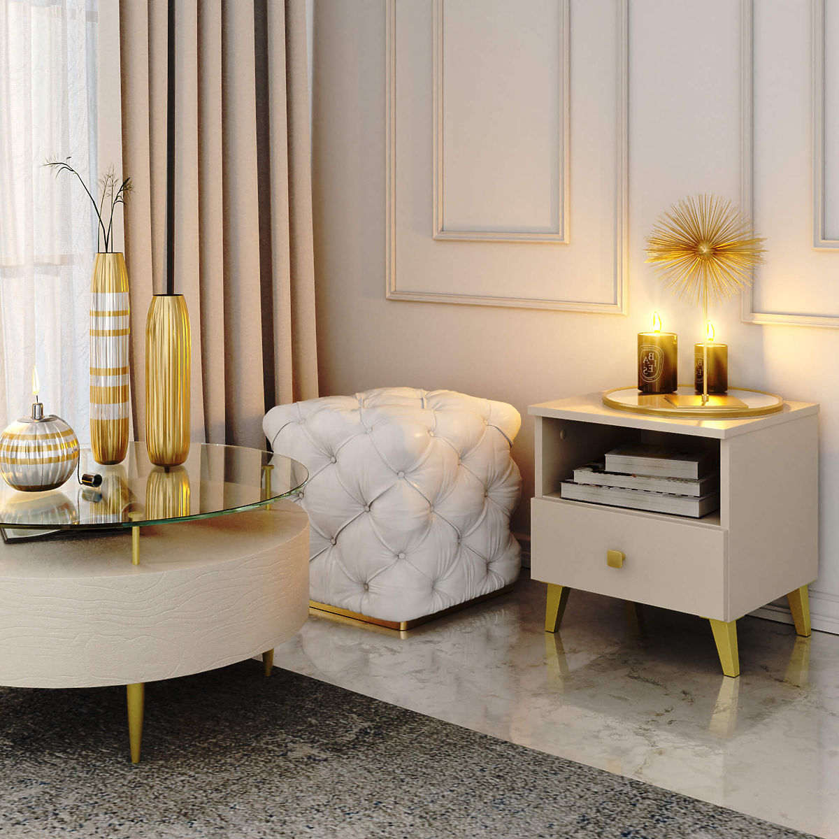 Nočna omarica MOBI K01 v kašmirju in zlatu z 1 predalom in 1 polico. .. več