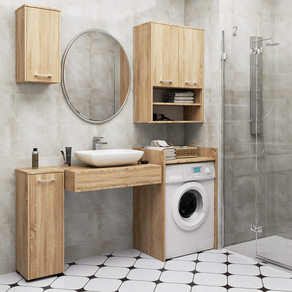 Če želimo imeti kopalnico urejeno udobno in hkrati stilsko, se moramo odločiti za trdno in funkcionalno pohištvo. Takšno je zagotovo pokrivalo nad pralni stroj. To je idealen način za izkoriščanje prostora nad pralnim strojem, ki običajno ostane neizkoriščen. Optimalne dimenzije tega stolpa ga naredijo za odlično rešitev za kopalnice z majhno površino. Ergonomična oblika omogoča njegovo uporabo v vsakem prostoru. Čudovit odtenek hrasta sonoma zagotavlja eleganten videz kopalnice. Laminirana plošča, iz katere je ta omara izdelana, je visokokakovosten material. Zagotavlja trajnost in trdnost pohištva ter ohranjanje njegovega estetskega videza.