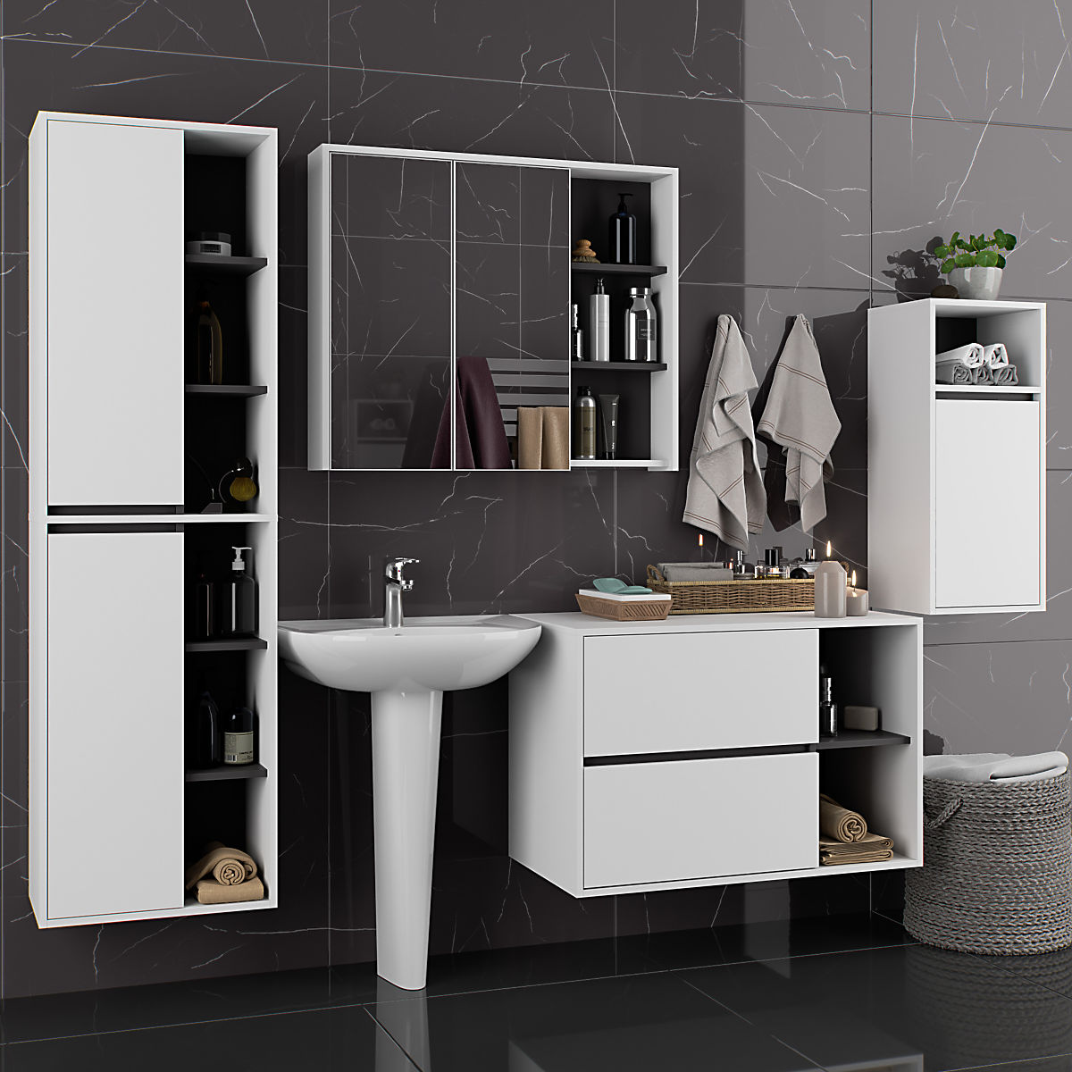 Omarice so neodvisne, kar omogoča njihovo razporeditev v poljubni konfiguraciji in razmakih glede na lastne potrebe. Cena velja samo za kopalniške omarice, dekorativni elementi niso vključeni v komplet.