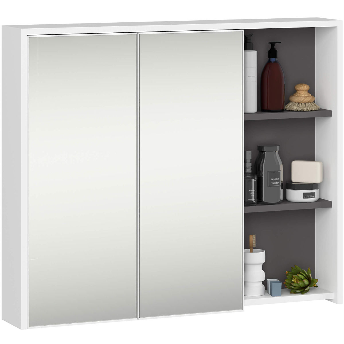 Komplet kopalniškega pohištva VAMI je kvintesenca modernega stila. Zahvaljujoč odprtim policam so omarice vizualno lahke in se popolnoma ujemajo z najnovejšimi oblikovalskimi trendi. Kopalniško pohištvo VAMI ponuja tudi veliko zaprtega prostora za shranjevanje čistilnih sredstev, kopalniških potrebščin in kozmetike. Komplet vključuje visečo omarico pod umivalnikom s ploščo, 2 predaloma in 2 odprtima policama (W90), visečo omarico z 1 odprto polico W35, visoko visečo omarico W50 s 6 odprtimi policami in visečo omarico z ogledalom in 3 odprtimi policami W90. Celotno pohištvo je barvno in stilsko enotno, kar daje kompletu harmoničen videz. Omarica pod umivalnikom ima oblikovane predale, ki omogočajo namestitev sifona in hidravličnih elementov. Komplet vsebuje: