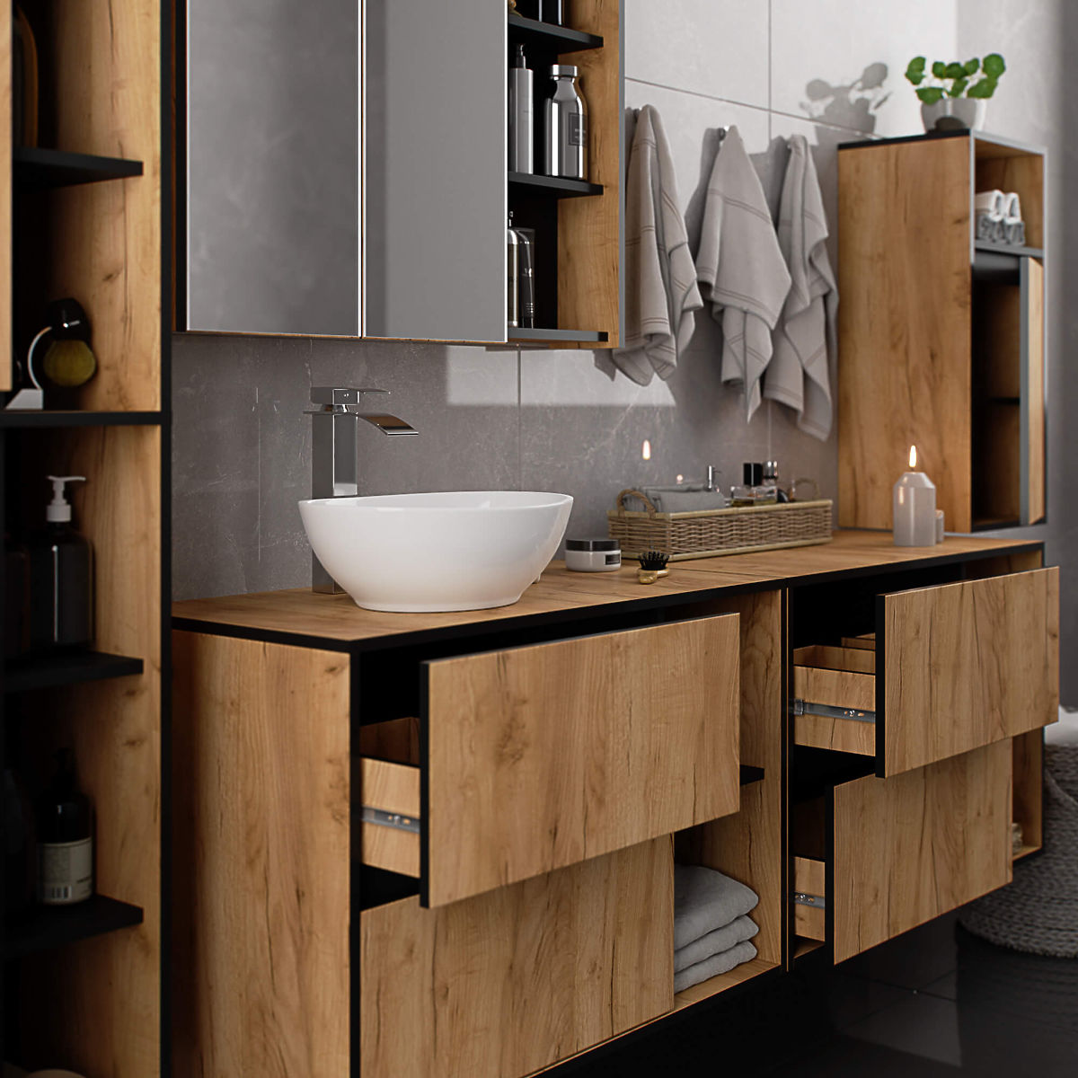 Stenska omarica za kopalnico pod umivalnik 90 cm VAMI W90 se popolnoma prilega modernemu interierju. Konfiguracija z 2 predaloma in 2 odprtima policama ponuja veliko udobja pri uporabi. V prostorne predale lahko shranite higienske in kozmetične izdelke, medtem ko lahko na odprte police postavite na primer dekoracije, ki interierju dodajo bolj oseben značaj. Ta model stenske omarice pod umivalnik ima v plošči 2 odprtini, namenjeni za montažo umivalnika in sifona. Omarica ima tudi posebej oblikovane predale, ki omogočajo namestitev sifona in hidravličnih elementov. POZOR! Pohištvo je dobavljeno brez umivalnika in armature.