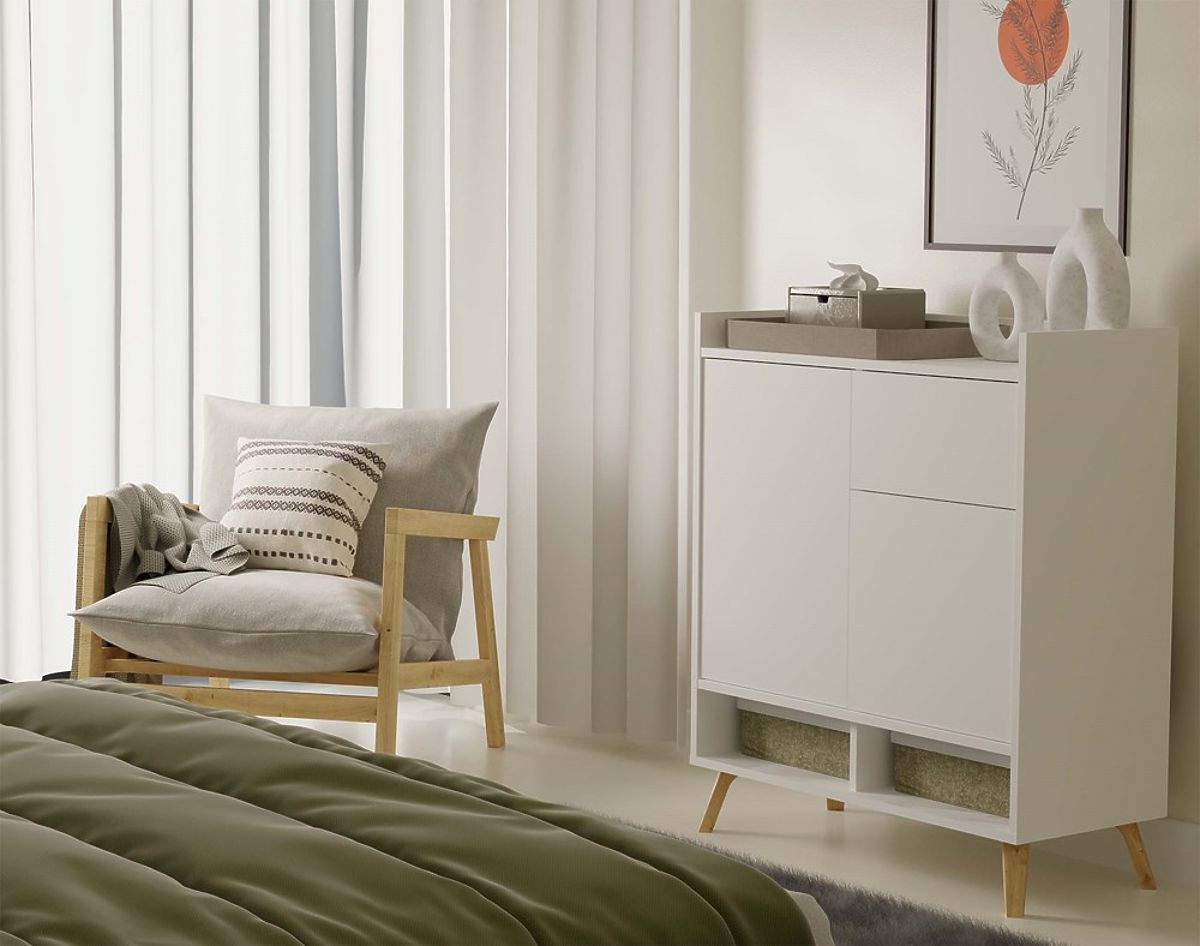 Komoda Colin v beli barvi je popolna kombinacija funkcionalnosti in moderne estetike, idealna za svetle in prostorne interierje.