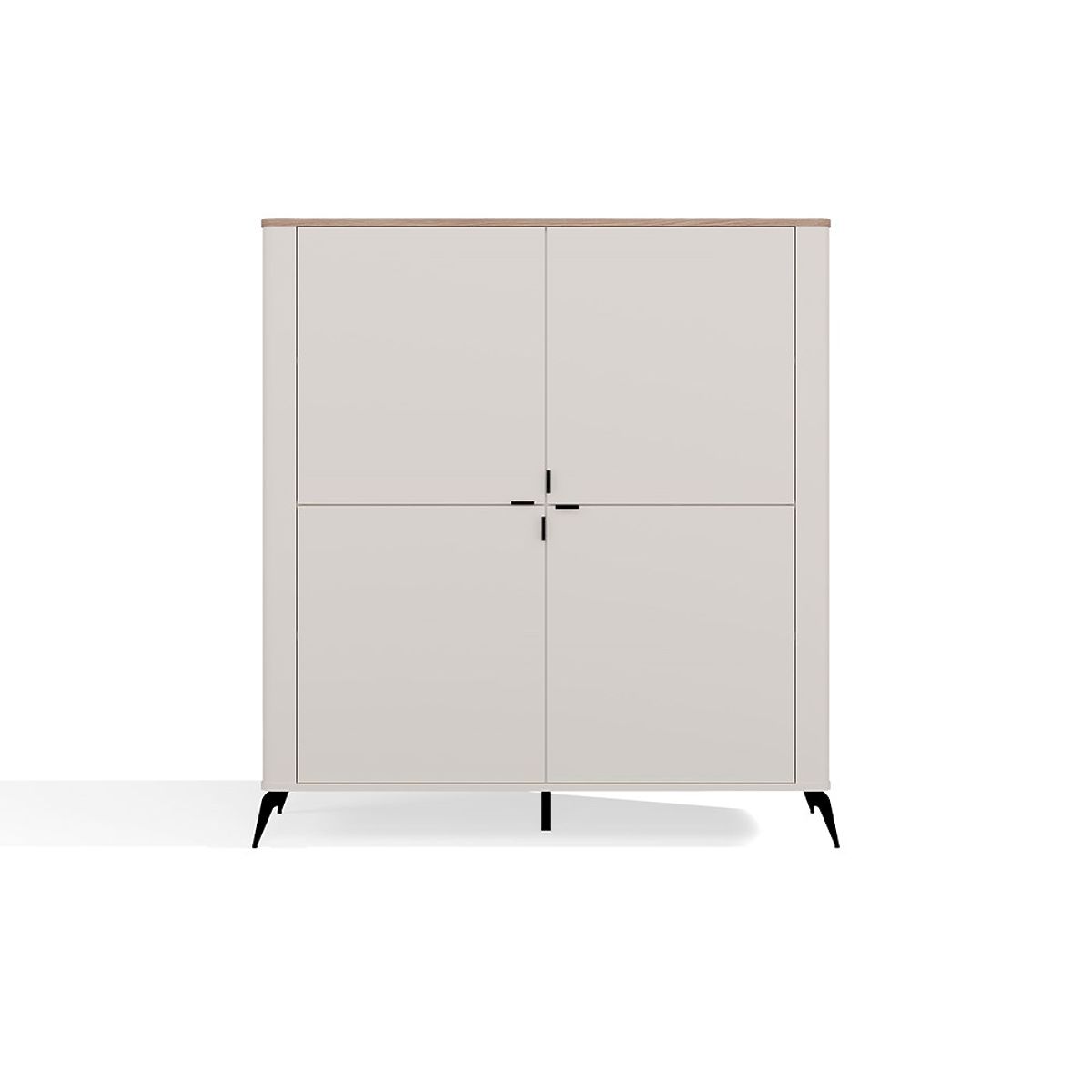 Model je opremljen s štirimi vrati s tihim zapiranjem, za katerimi se skriva do osem praktičnih polic – idealnih za shranjevanje knjig, dokumentov, tekstila ali vsakodnevnih dodatkov.