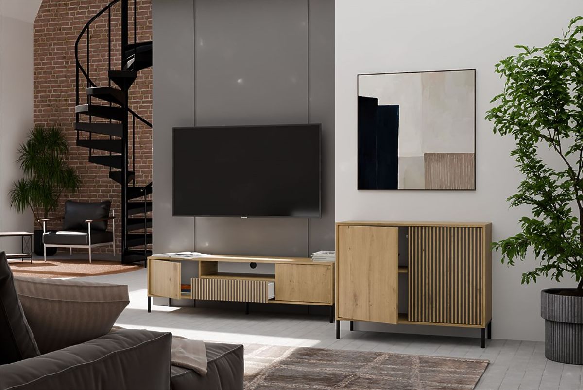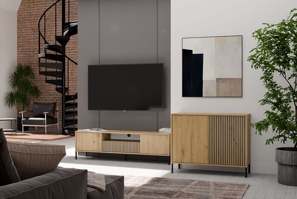 Komoda KAMARO 2D SLIM/GLADKI HRAST ARTISAN združuje estetiko in funkcionalnost, ki se odlično poda v dnevno sobo, gostinsko sobo, spalnico ali delovno sobo. Zahvaljujoč rebrastemu čelu enih vrat (ki spominja na letvice) pohištvo pridobi moderen in izviren videz, ki se popolnoma ujema z modernimi interierji.