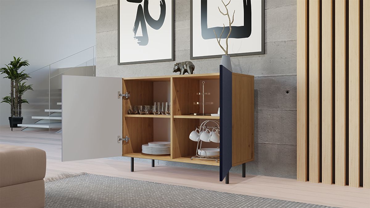 Velika prednost so okrogle kovinske noge višine 13 cm, ki celotni konstrukciji dajejo vizualno lahkotnost in zagotavljajo stabilnost komode.