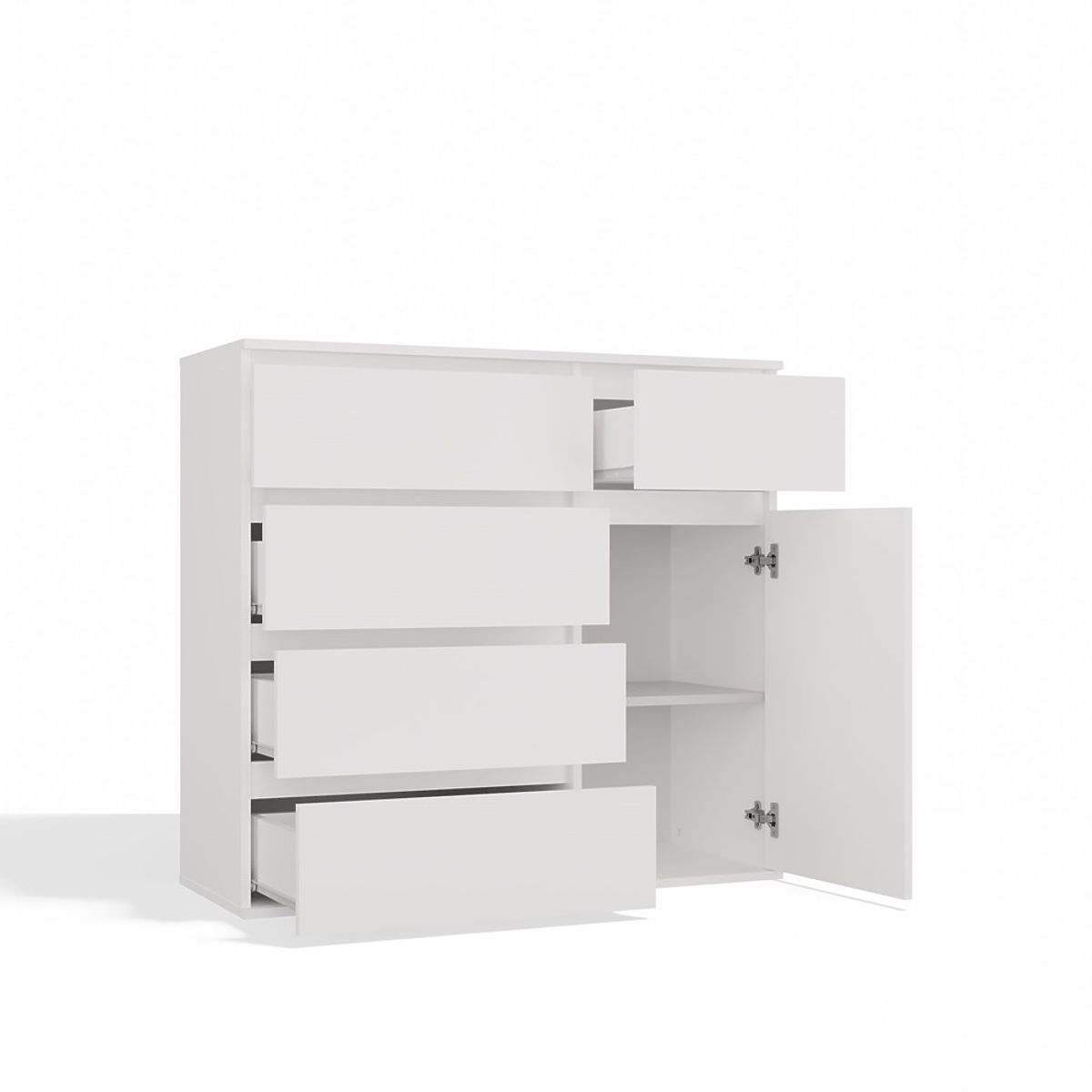 Komoda 1D5S v beli barvi je eleganten in funkcionalen kos pohištva, ki se odlično prilega spalnici, dnevni sobi, predsobi ali otroški sobi.