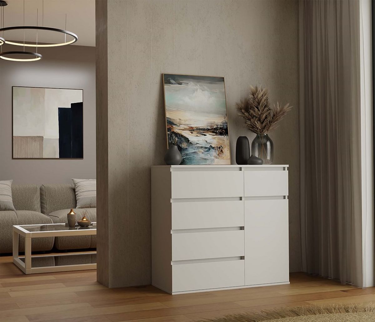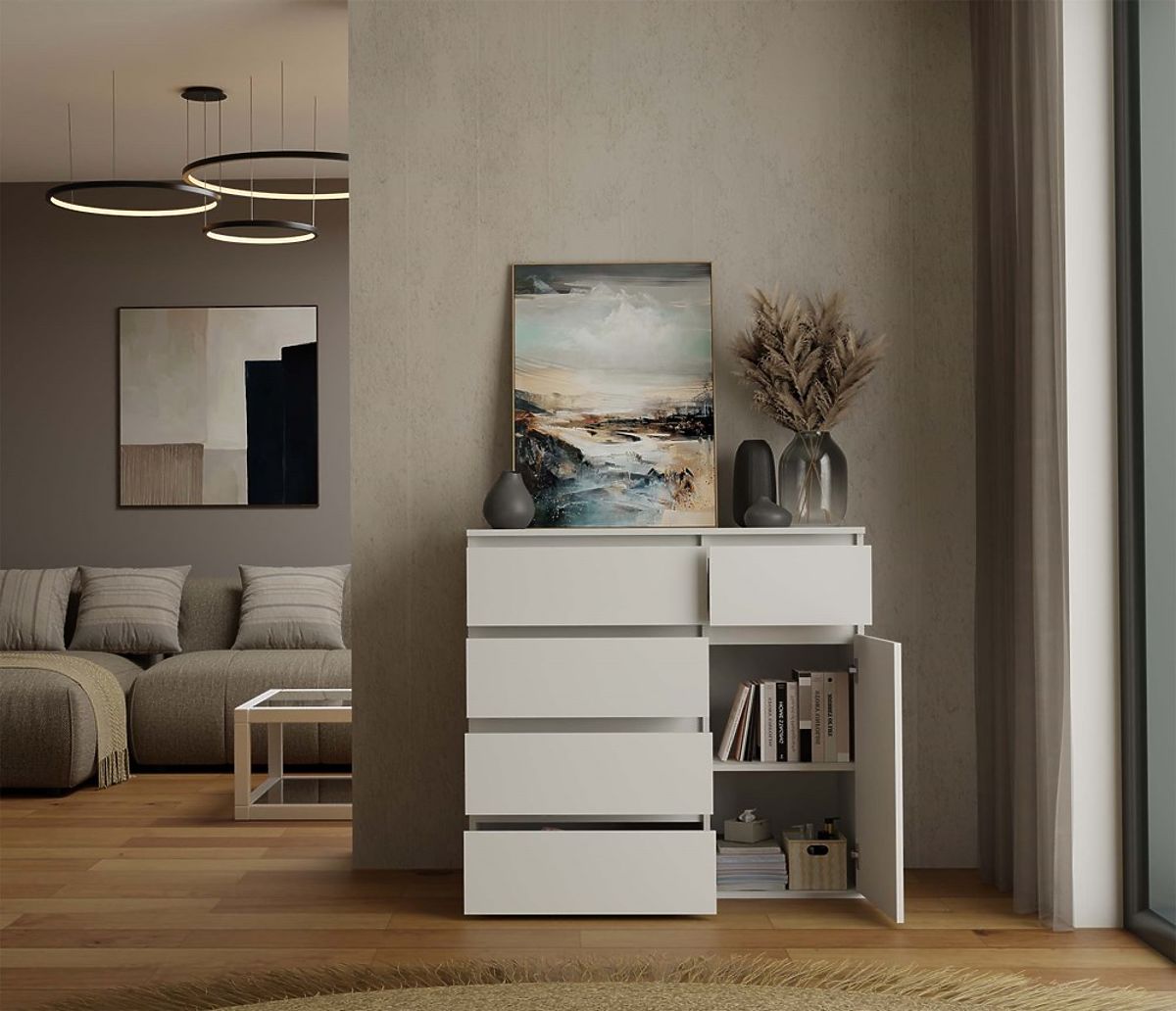 Komoda 1D5S v beli barvi je popolna kombinacija estetike in praktičnosti, idealna za moderne in klasične interierje.