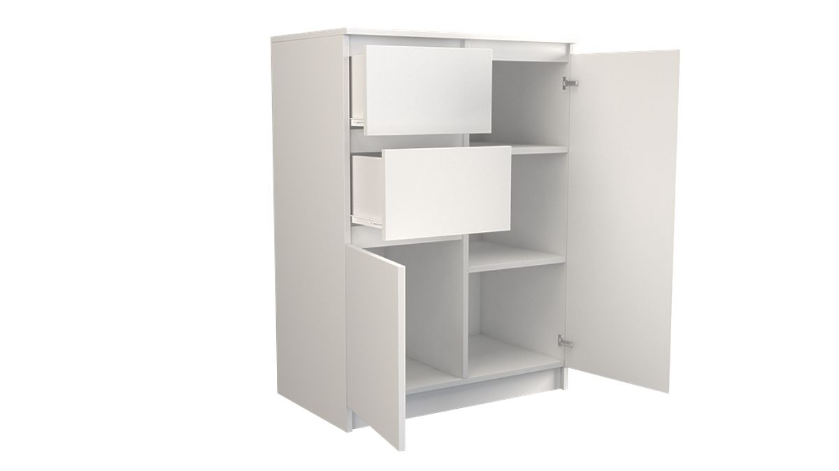 Notranjost komode je sestavljena iz polic in dveh predalov, ki pomagajo pri organizaciji stvari. Lažje boste našli, kar iščete.