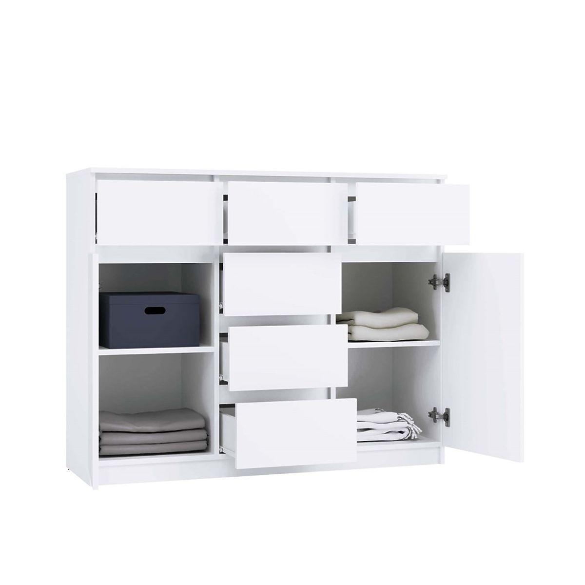 Univerzalen dizajn: Preprosta, elegantna oblika komode v mat beli barvi zagotavlja, da se prilega tako modernim kot klasičnim interierjem. Brezročajna sprednja površina poudarja minimalističen značaj in hkrati zagotavlja udobno uporabo.