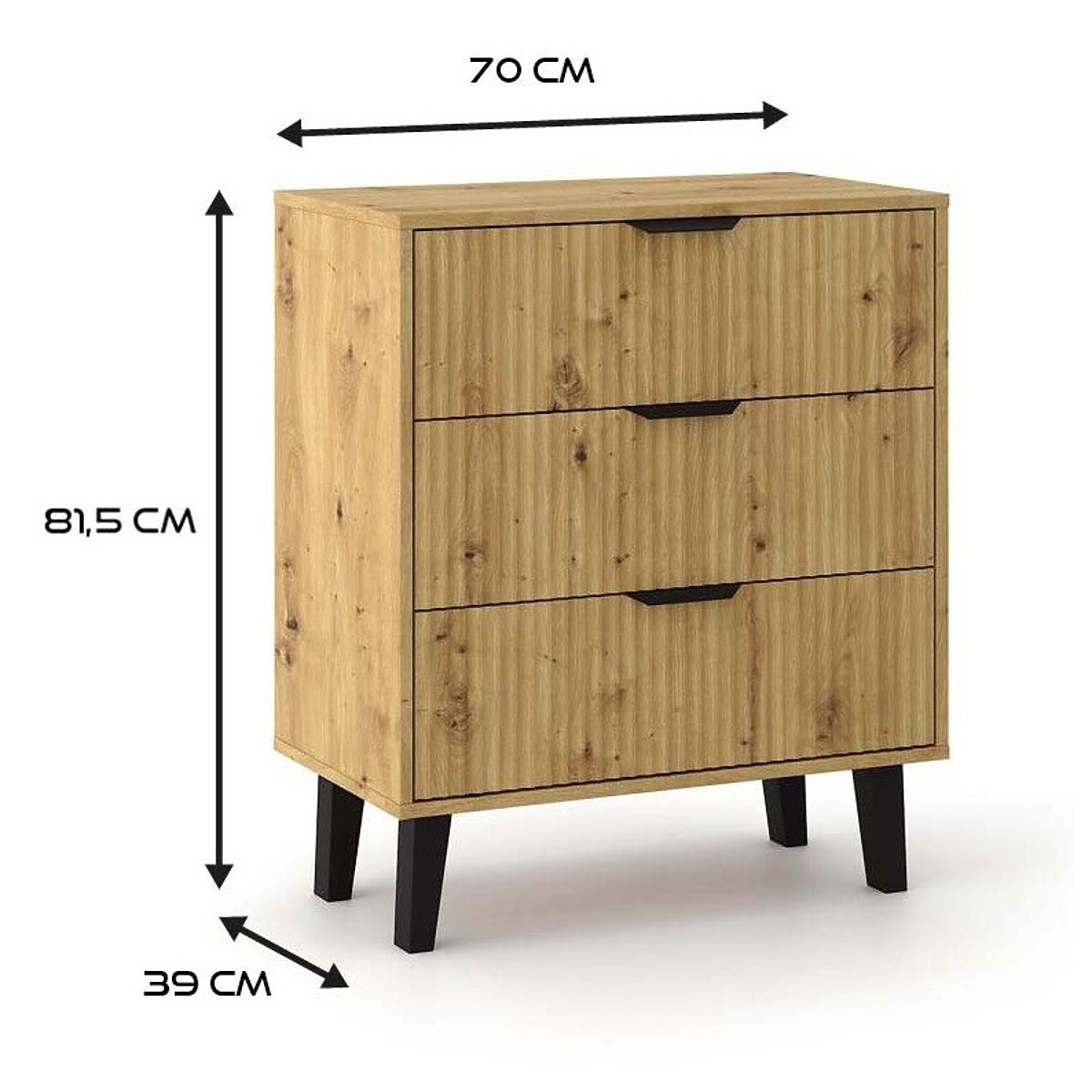 Komoda SCANDI 3S SLIM je odlična izbira za tiste, ki iščejo praktično pohištvo za shranjevanje z dotikom modernega dizajna. Topel odtenek Hrasta Artisan v kombinaciji z utorjenimi frontami in visokimi črnimi nogami dodaja notranjosti prijetnost in hkrati eleganco.