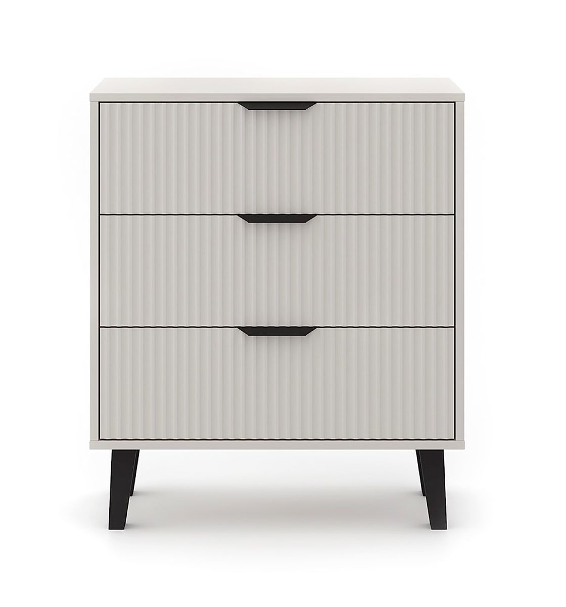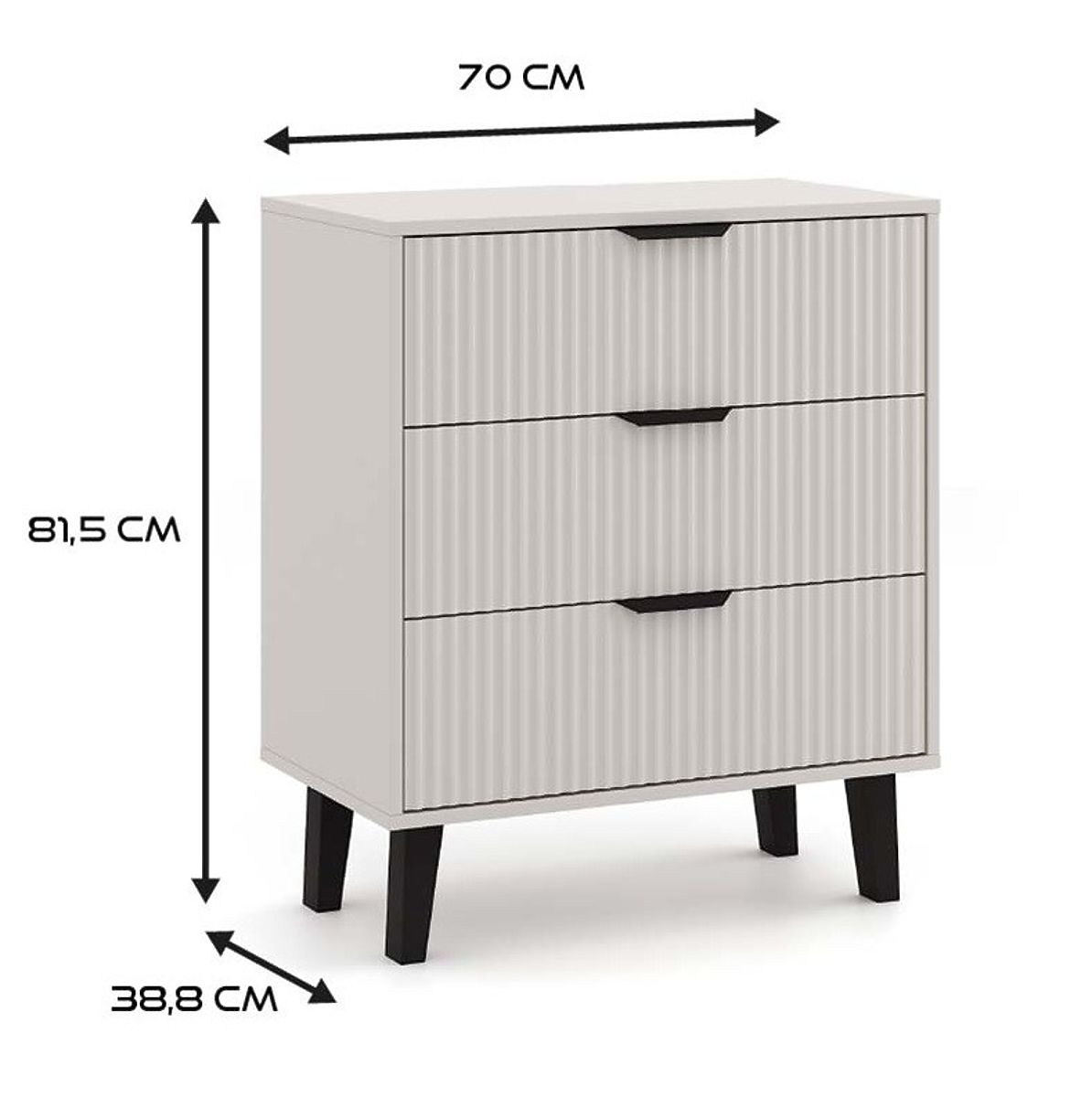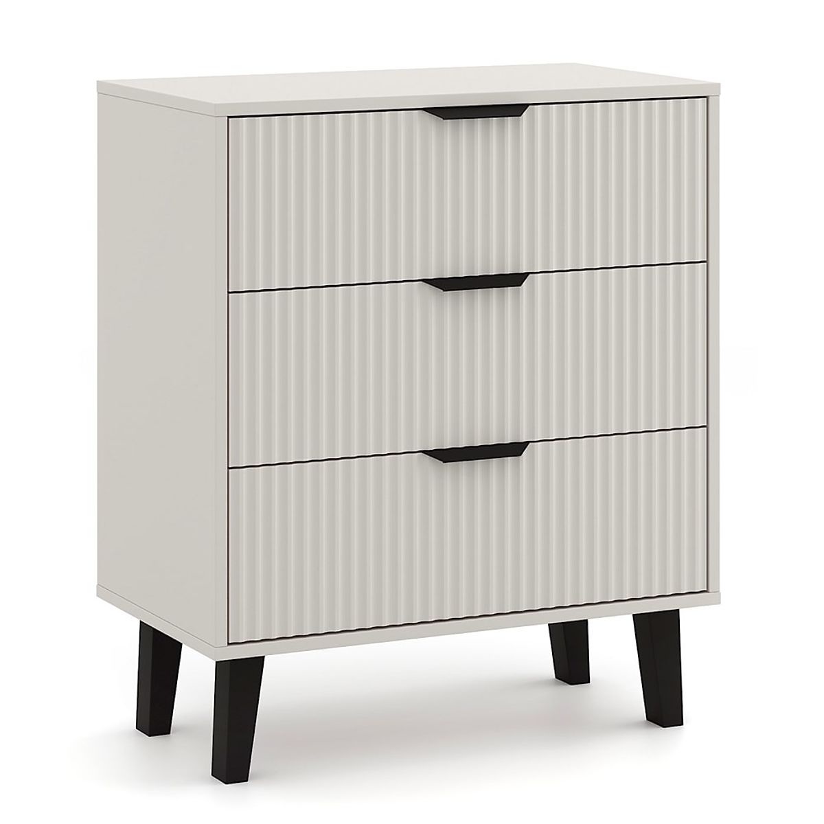 Komoda SCANDI 3S SLIM je odlična izbira za tiste, ki iščejo praktično shranjevalno pohištvo z dotikom modernega dizajna. Modna barva Kašmir v kombinaciji z rebrastimi frontami in visokimi črnimi nogami doda notranjosti udobje in eleganco.