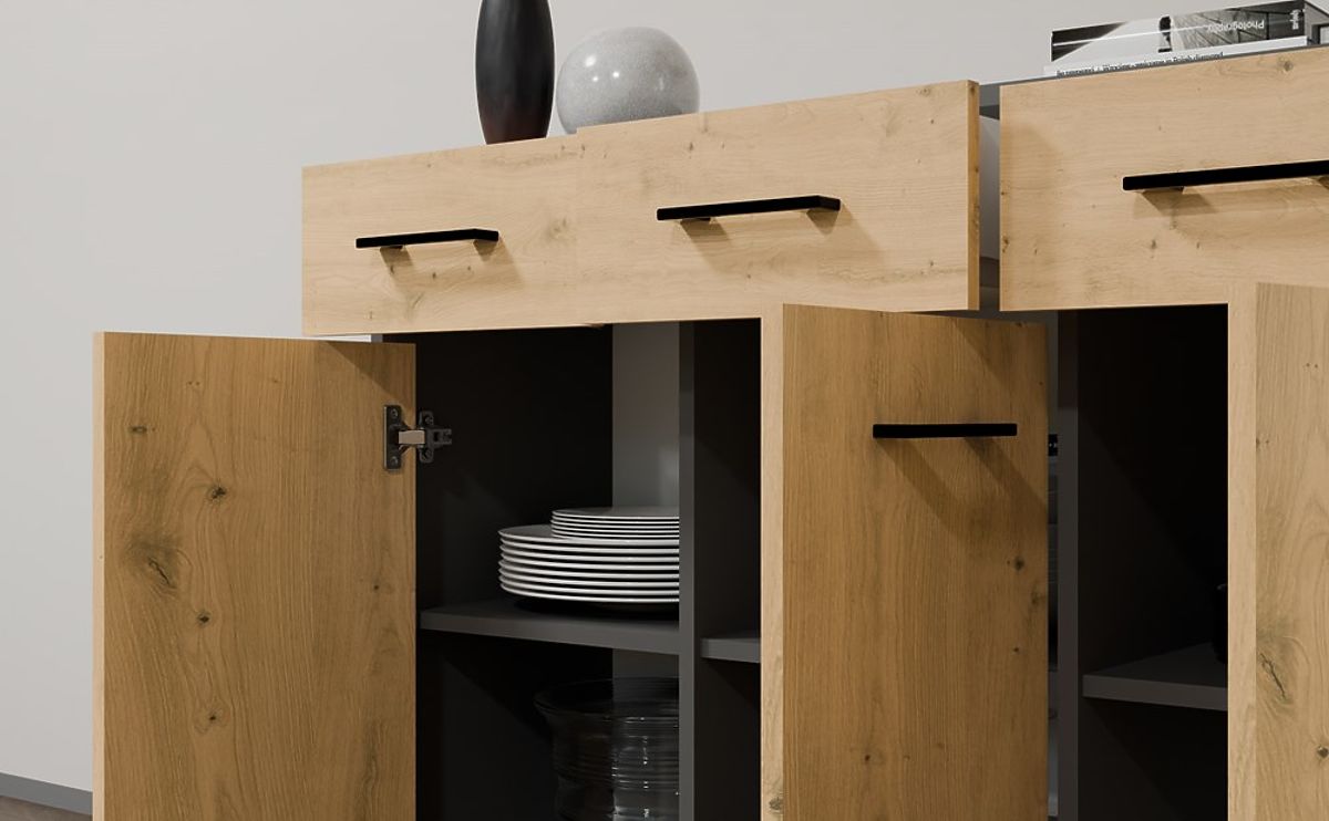 Komoda Simplo 3D3S je kombinacija stila in funkcionalnosti, ki se odlično prilega dnevni sobi, spalnici, predsobi ali otroški sobi. Moderna kombinacija temnega korpusa v antracitni barvi s naravnim dekorjem front hrast artisan prinaša v notranjost toplino in eleganco.