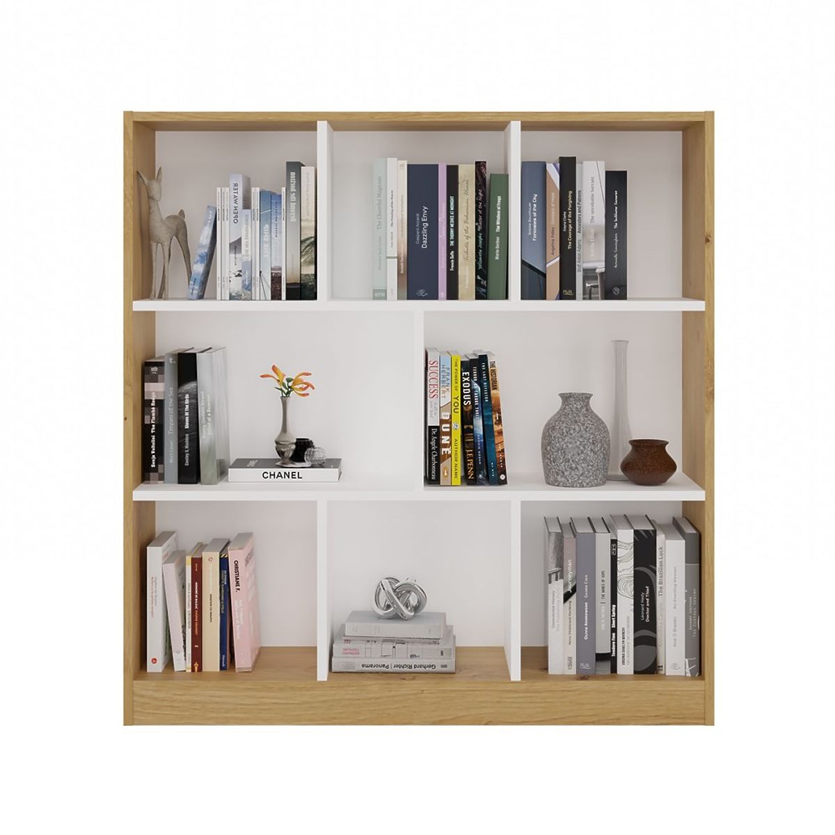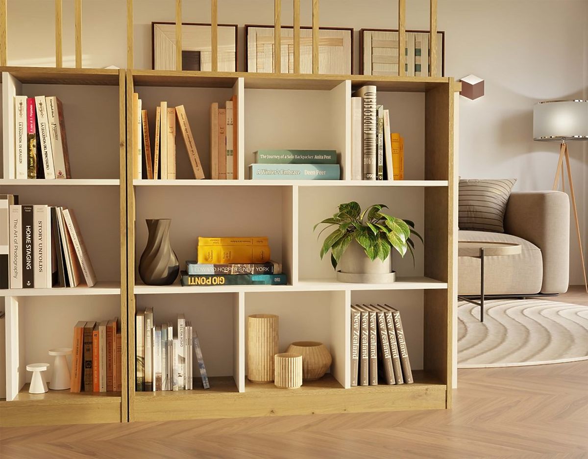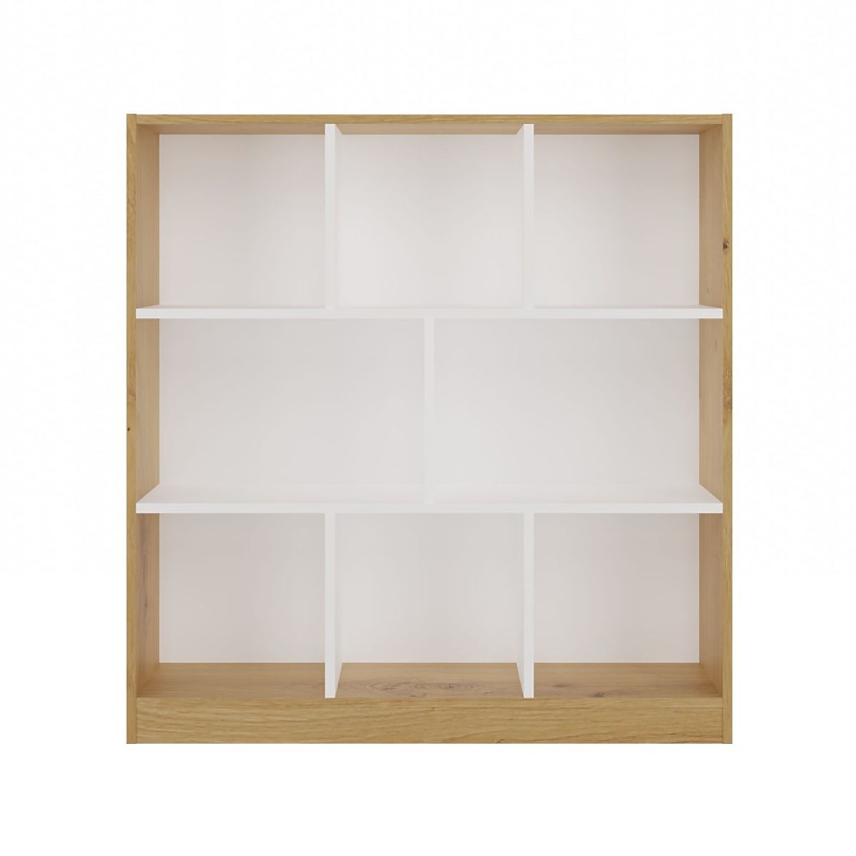 Vsebuje 8 prostorskih predelkov, ki pomagajo pri organizaciji prostora in omogočajo estetsko razstavljanje priljubljenih predmetov. Kombinacija toplega odtenka hrasta artisan s kontrastnimi belimi policami daje pohištvu sodoben in eleganten značaj.