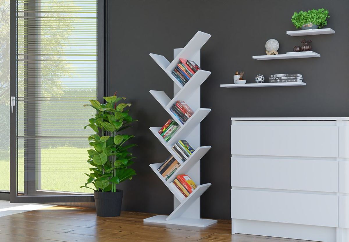 Moderni geometrični regal s poševnimi policami za knjige. .. več