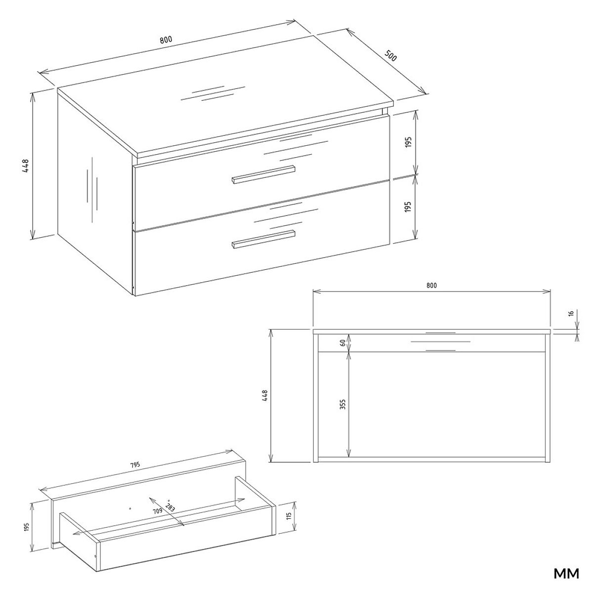Pohištvo je opremljeno z dvema prostornima predaloma, idealnima za shranjevanje kozmetike, brisač ali drugih kopalniških dodatkov. Oba predala imata polno globino – nimata izrezov za sifon. Uporaba stenskega sifona omogoča popolno izkoriščenost prostora.