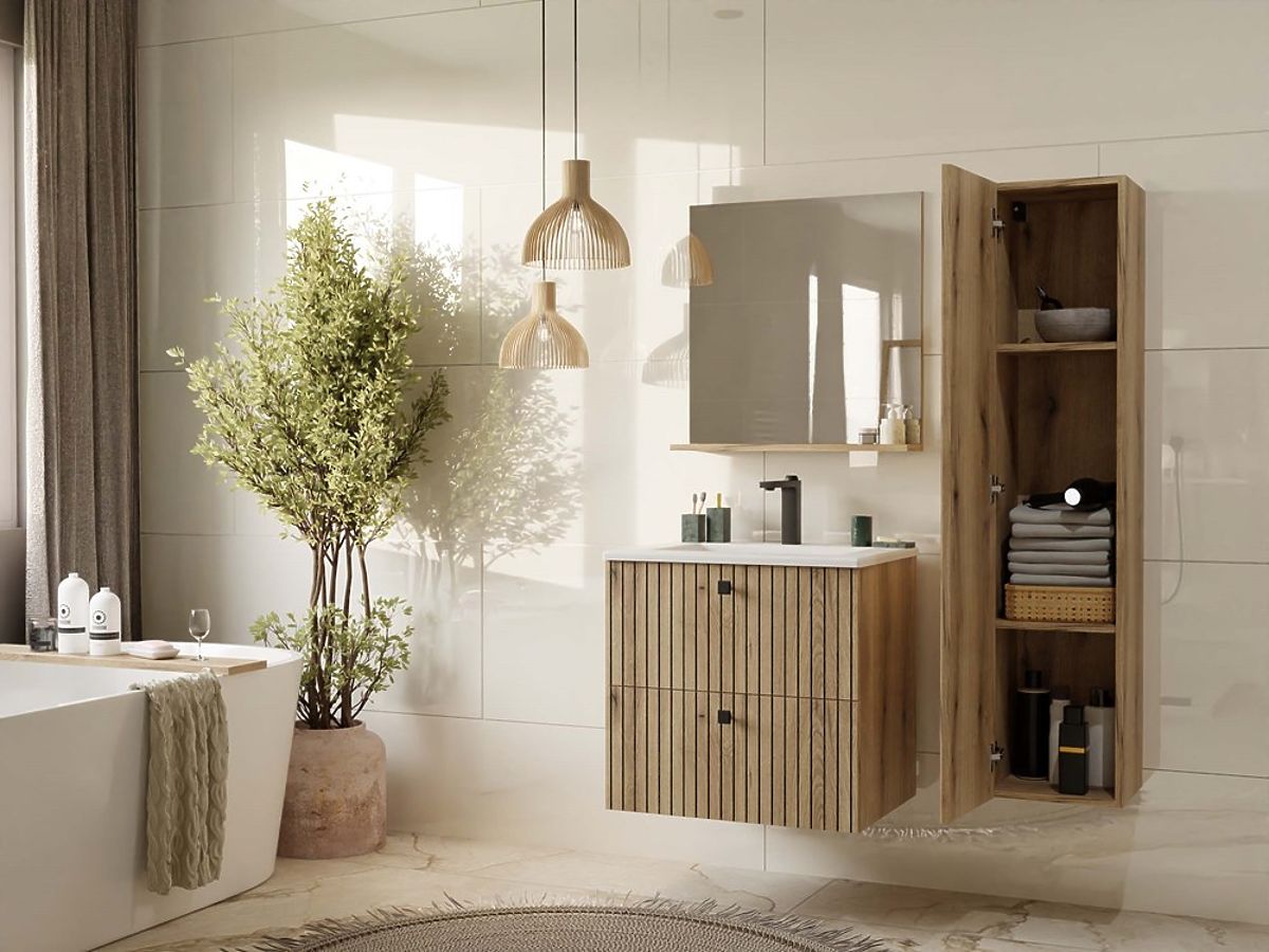 Set TIGO 60 2S z belim nadgradnim umivalnikom, prilagojenim širini omarice, je moderna in funkcionalna izbira za kopalnice, kjer sta estetika in udobje pomembna. Elegantna rebrasta sprednja plošča dodaja značaj, medtem ko tiho zapiranje in kovinski ročaji zagotavljajo udobje pri vsakodnevni uporabi.