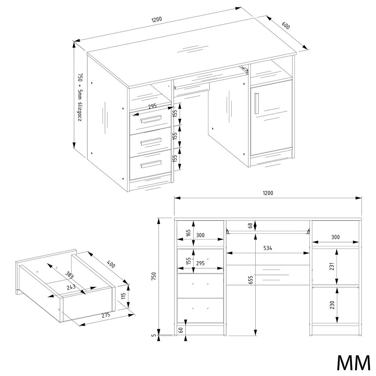 - Trije prostorni predali – idealni za dokumente, zvezke ali pisarniške potrebščine.