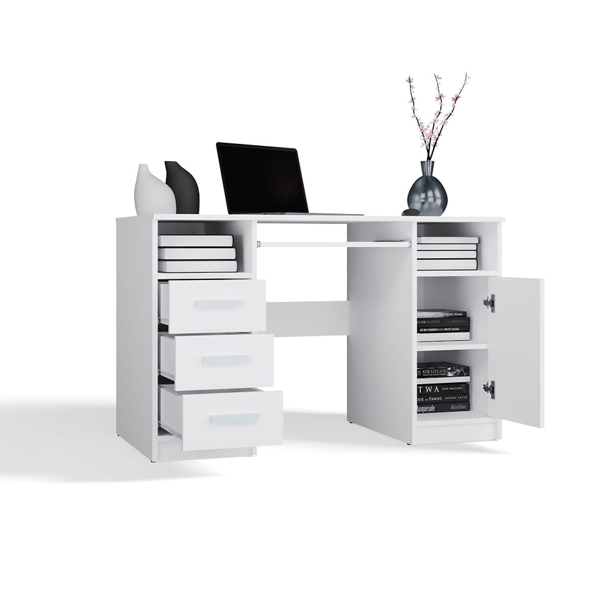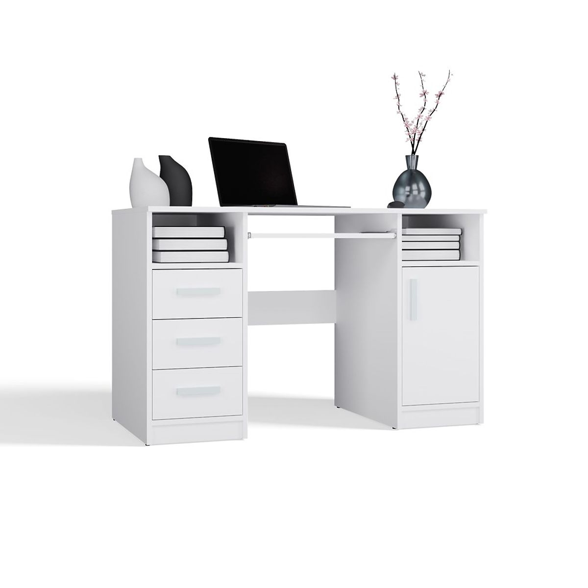 Opremljena s 3 predali in zaprtim omarico z 1 vrati in 2 policama, nudi dovolj prostora za shranjevanje dokumentov, knjig ali pisarniških potrebščin. Poleg tega je pod ploščo na voljo izvlečna polica za tipkovnico, kar olajša uporabo računalnika.